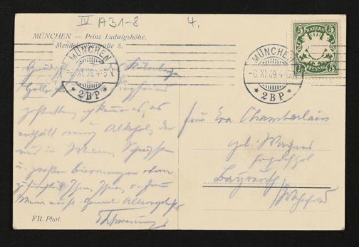 eigenhändige Postkarte von Ernst Schwenninger an Eva Chamberlain