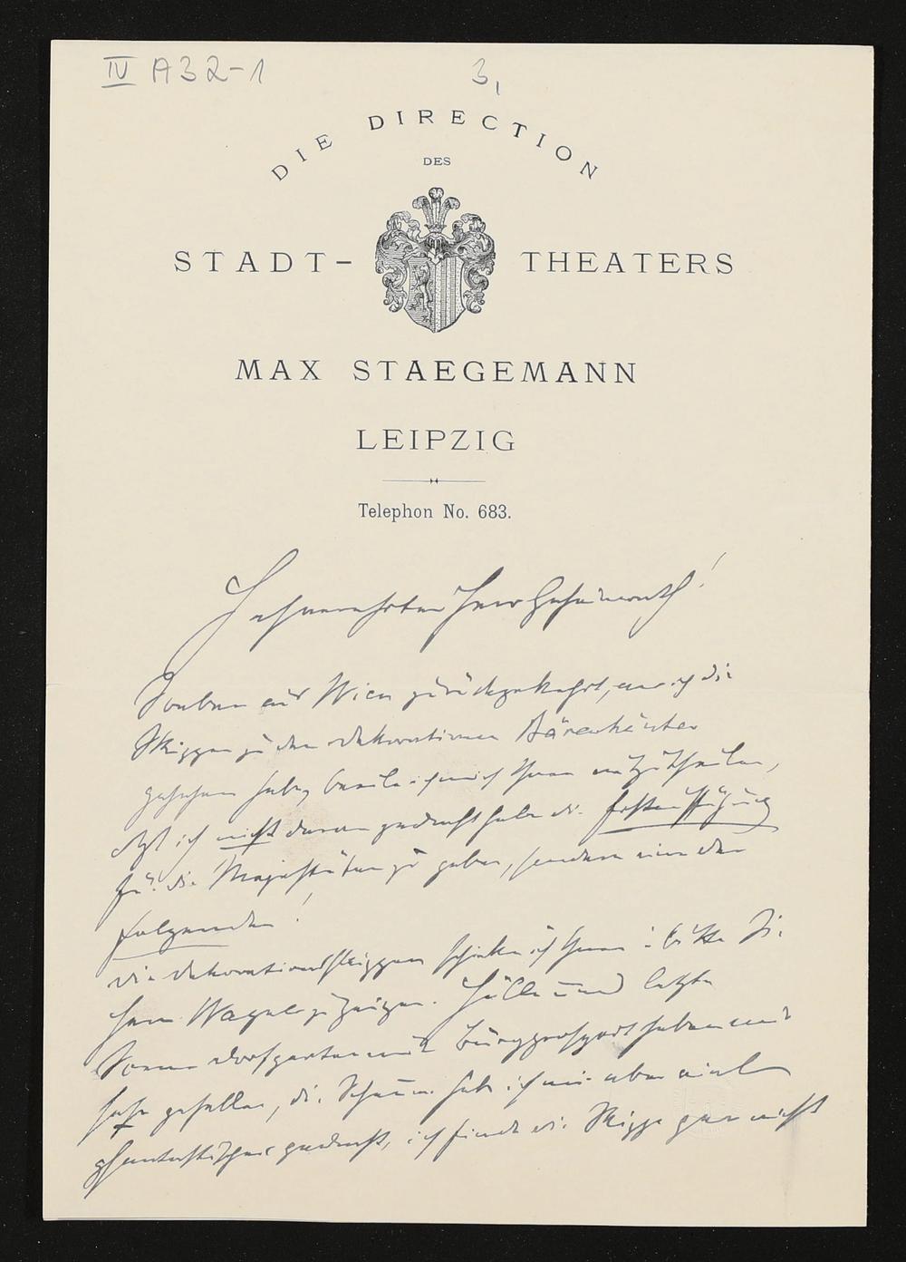 eigenhändiger Brief von Max Staegemann (Direktion des Stadttheaters Leipzig) an Julius Kniese