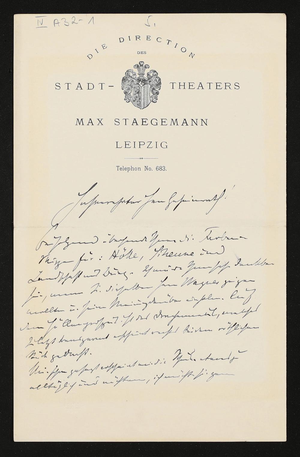 eigenhändiger Brief von Max Staegemann (Direktion des Stadttheaters Leipzig) an Julius Kniese