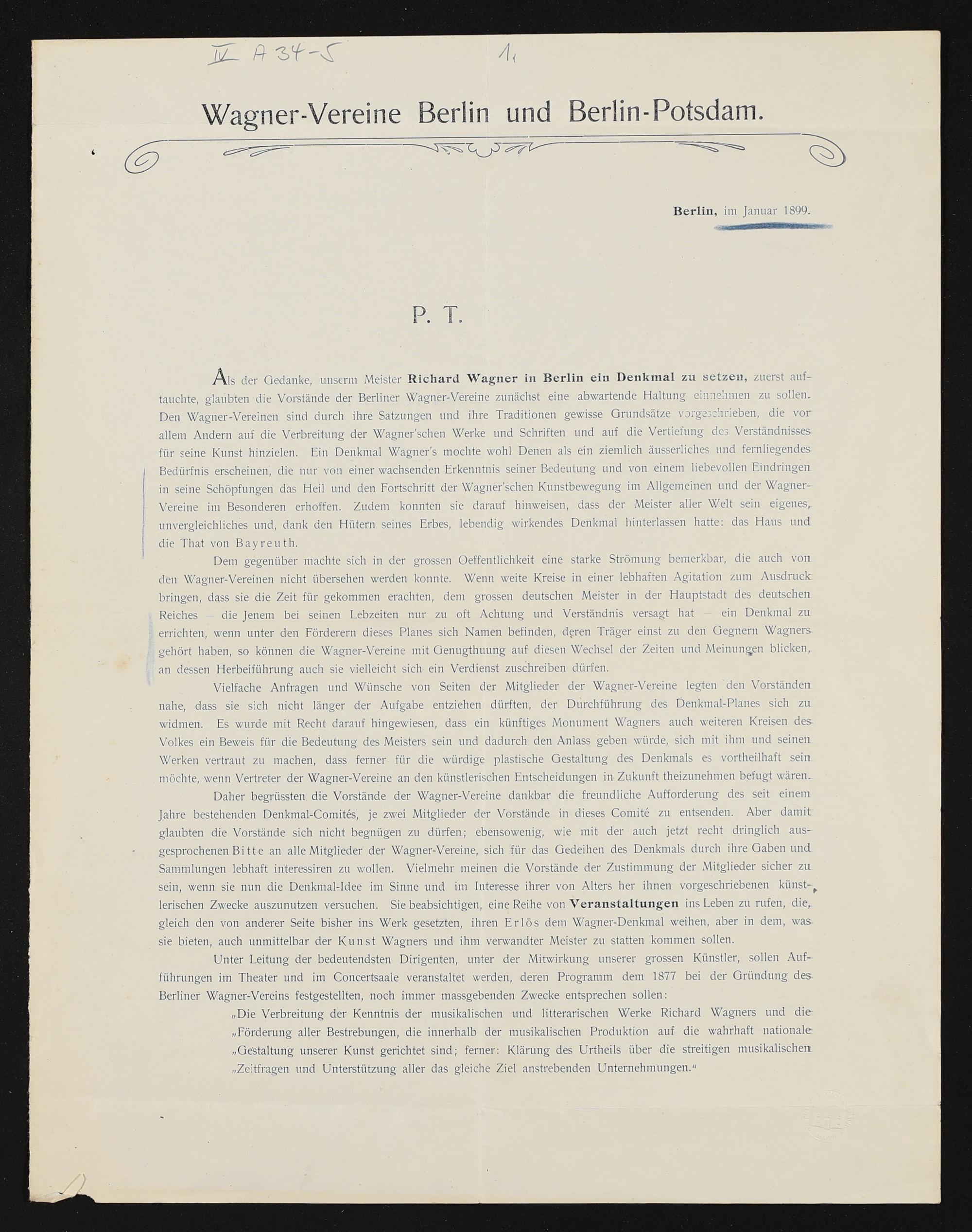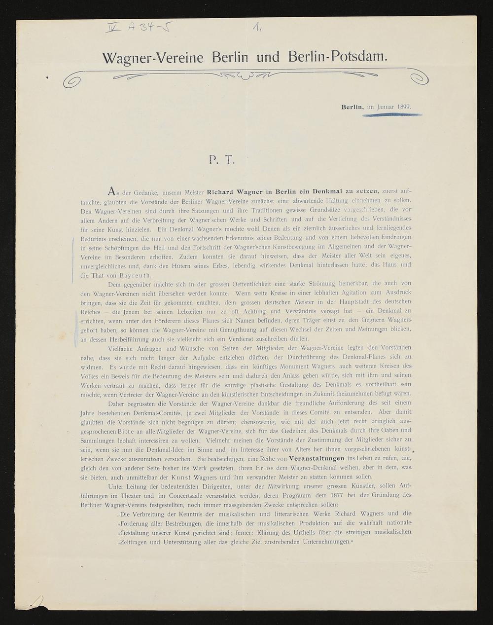 Wagner-Vereine Berlin und Berlin-Potsdam, Januar 1899, Druckschrift von Richard Sternfeld mit handschriftlichen Zeilen von fremder Hand