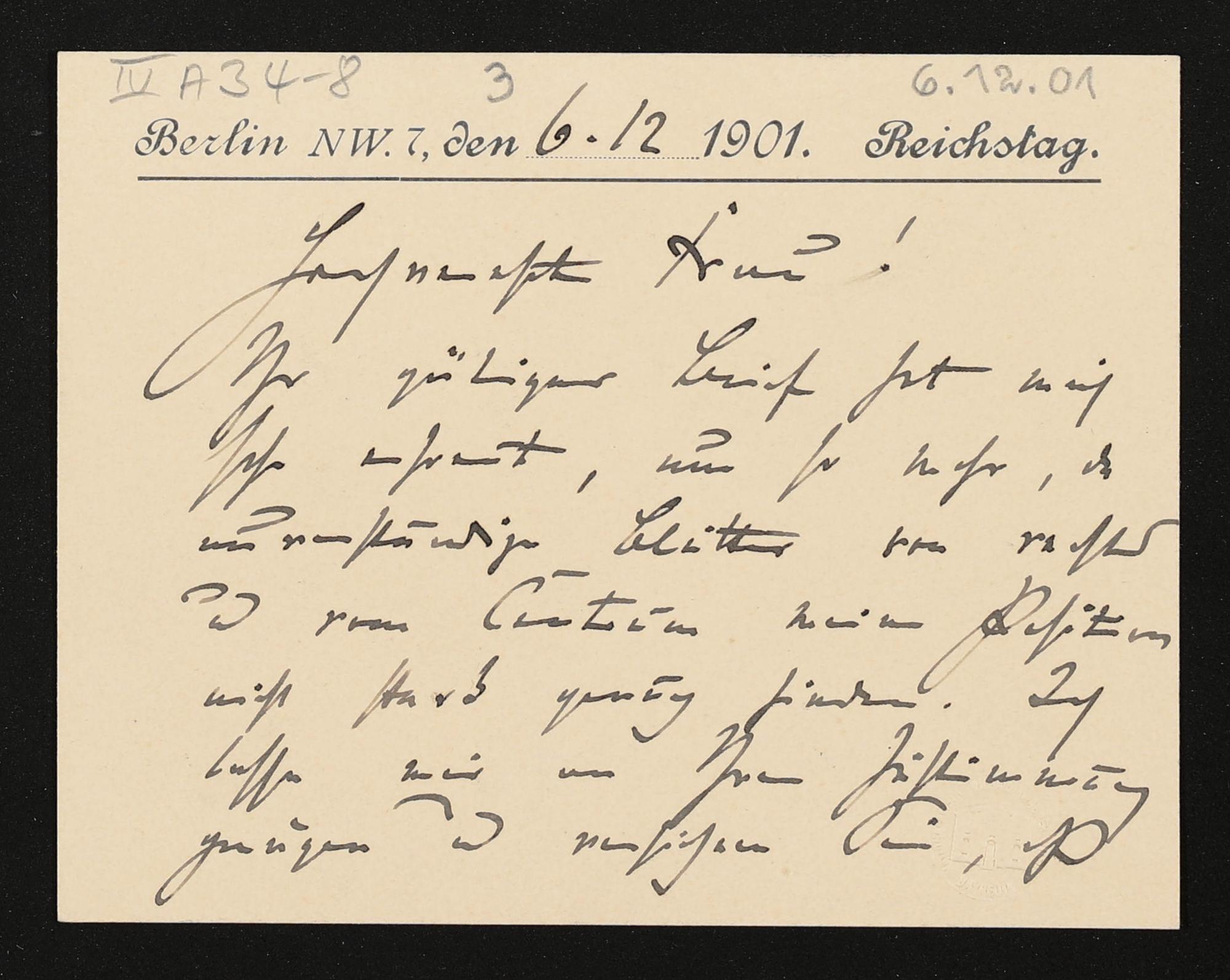 eigenhändige Briefkarte von Adolph Stoecker an Cosima Wagner