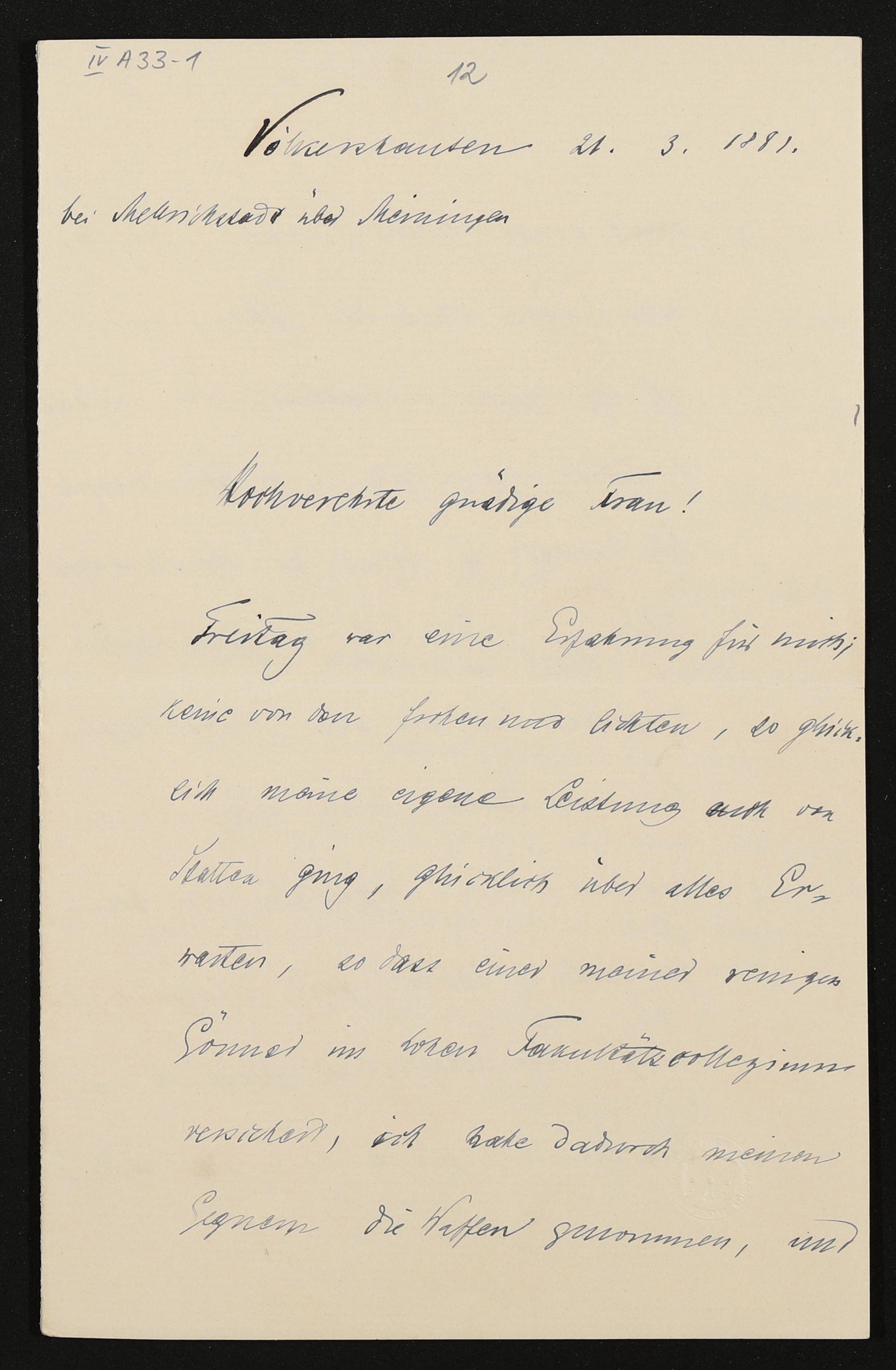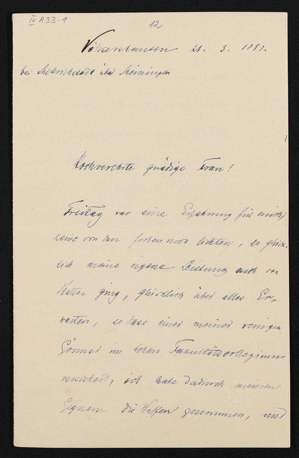 eigenhändiger Brief von Freiherr Heinrich von Stein an Cosima Wagner