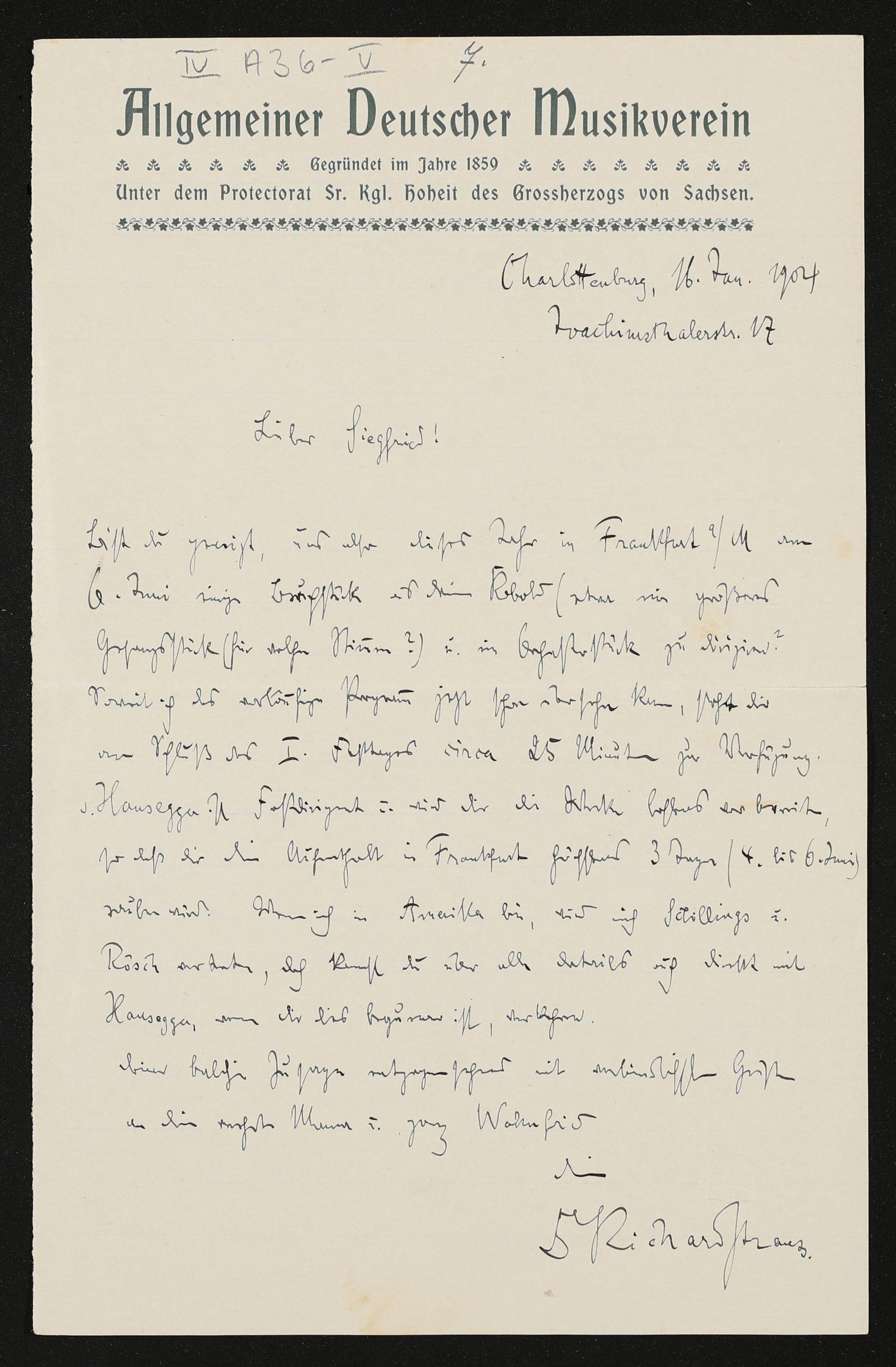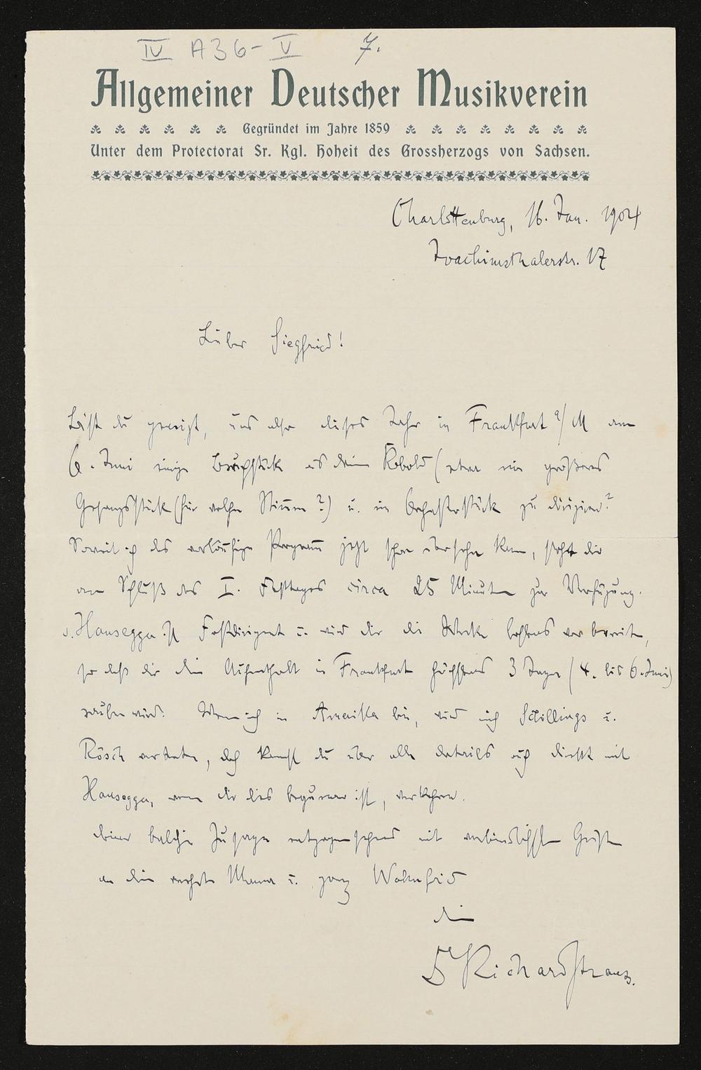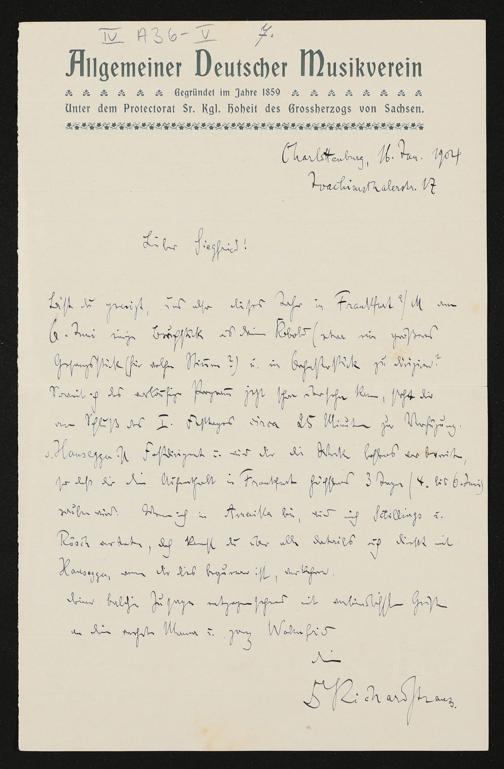 eigenhändiger Brief von Richard Strauss (Allgemeiner Deutscher Musikverein) an Siegfried Wagner