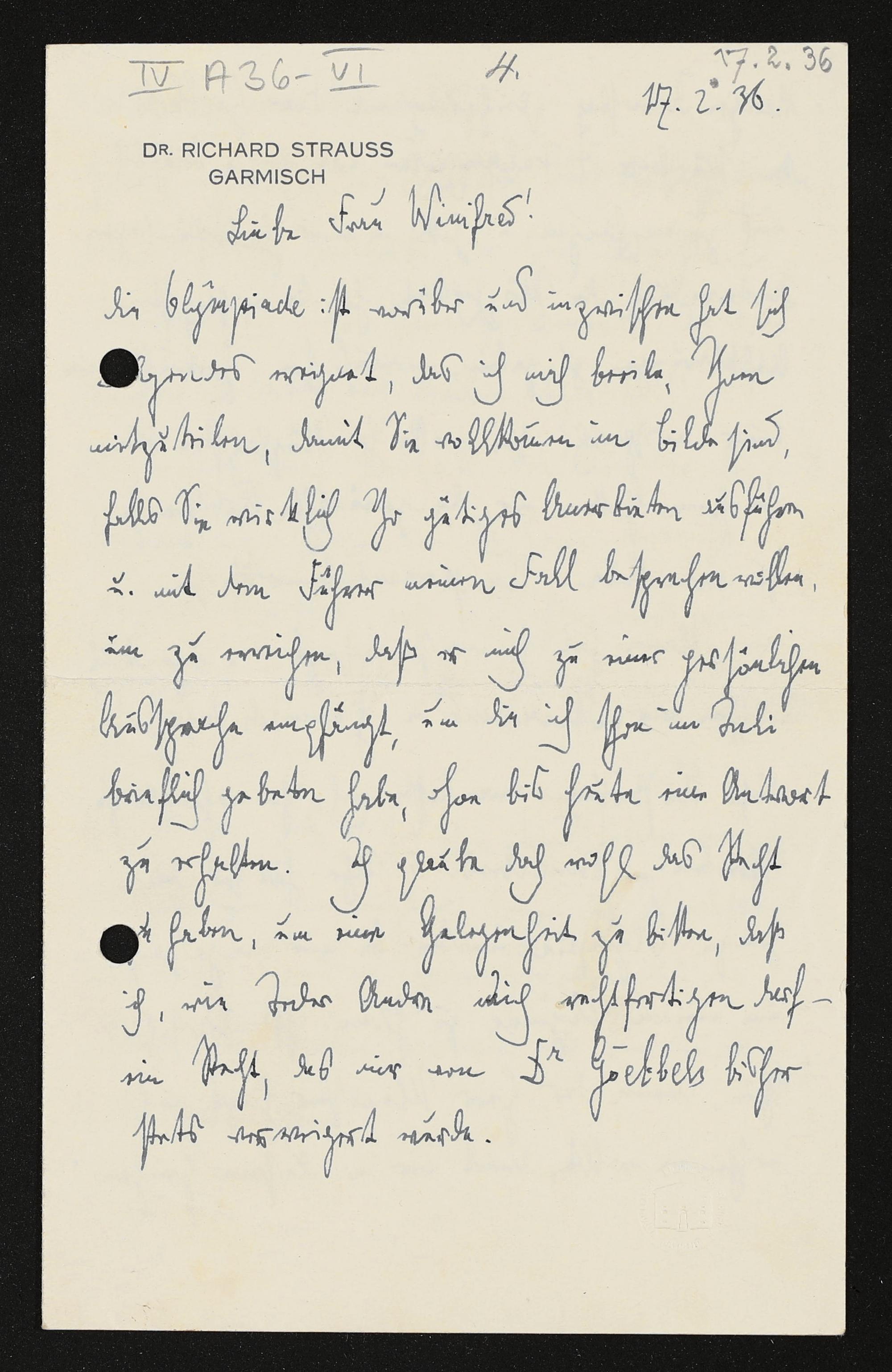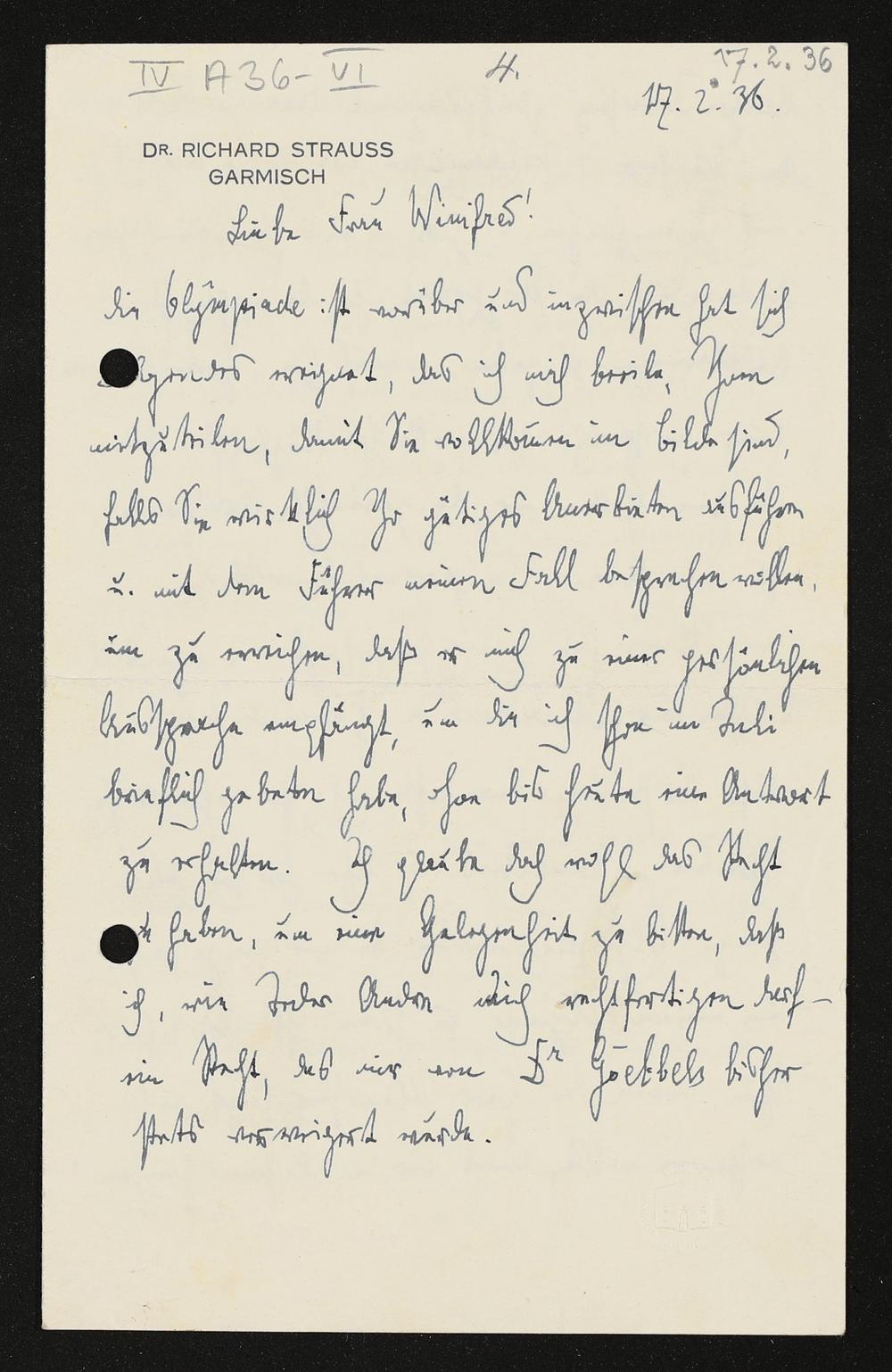 eigenhändiger Brief von Richard Strauss an Winifred Wagner
