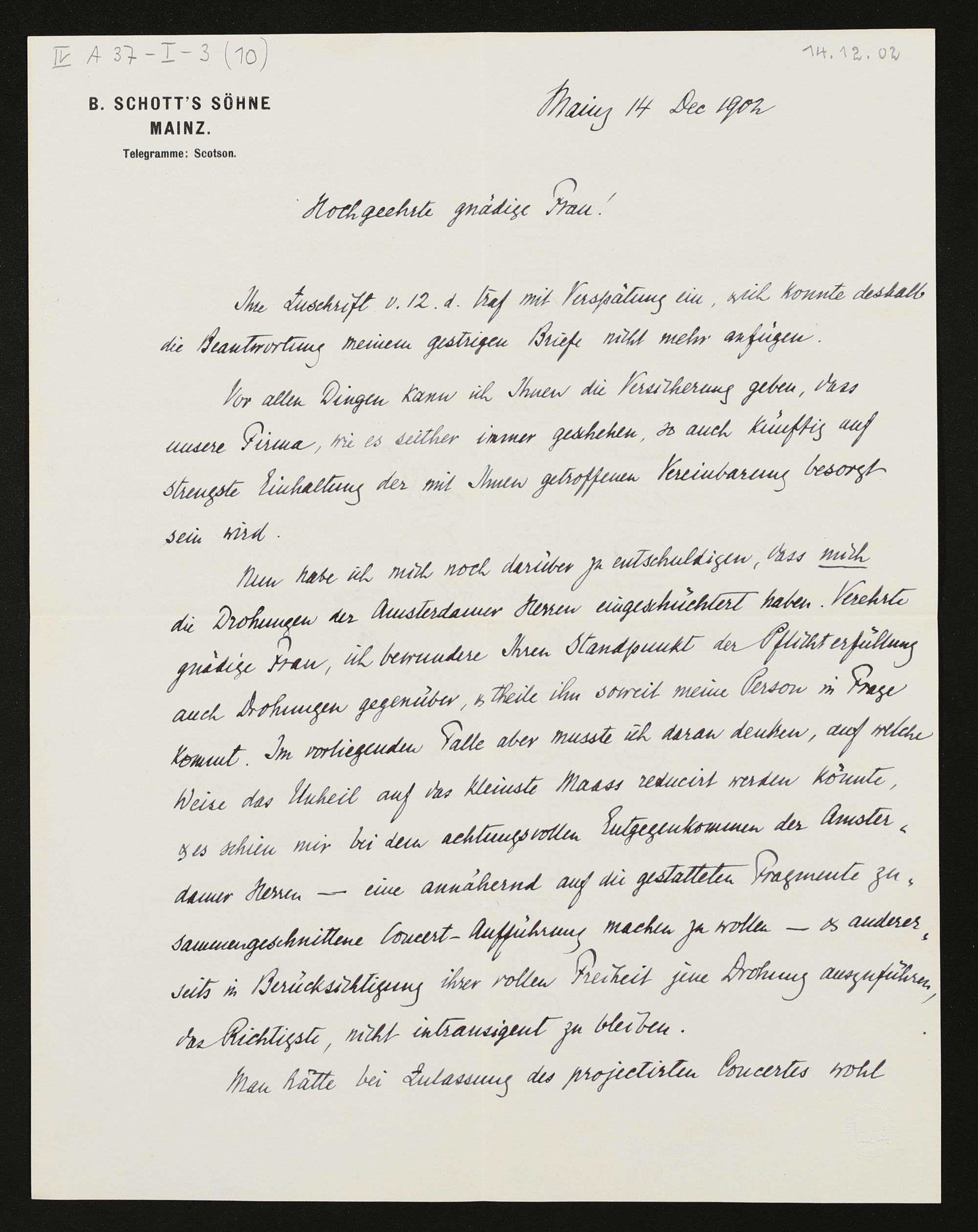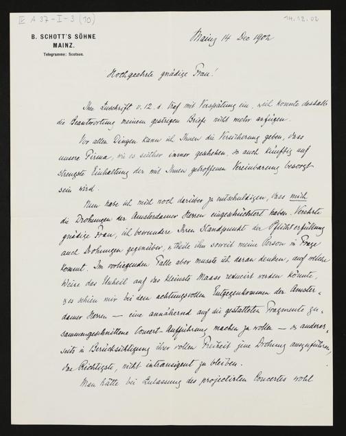 eigenhändiger Brief von Ludwig Strecker an Cosima Wagner