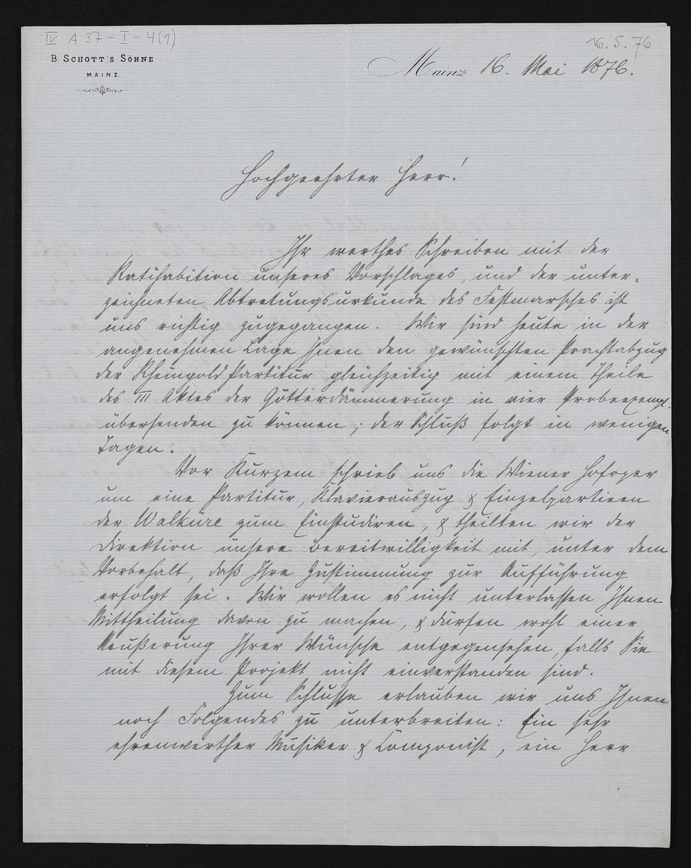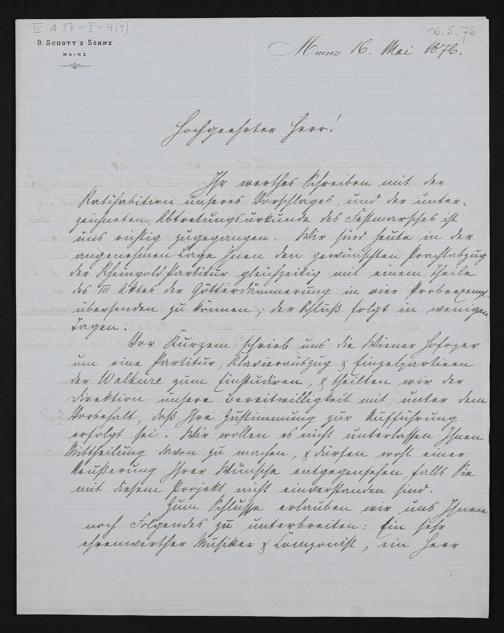 eigenhändiger Brief von Ludwig Strecker (B. Schott's Söhne) an Richard Wagner