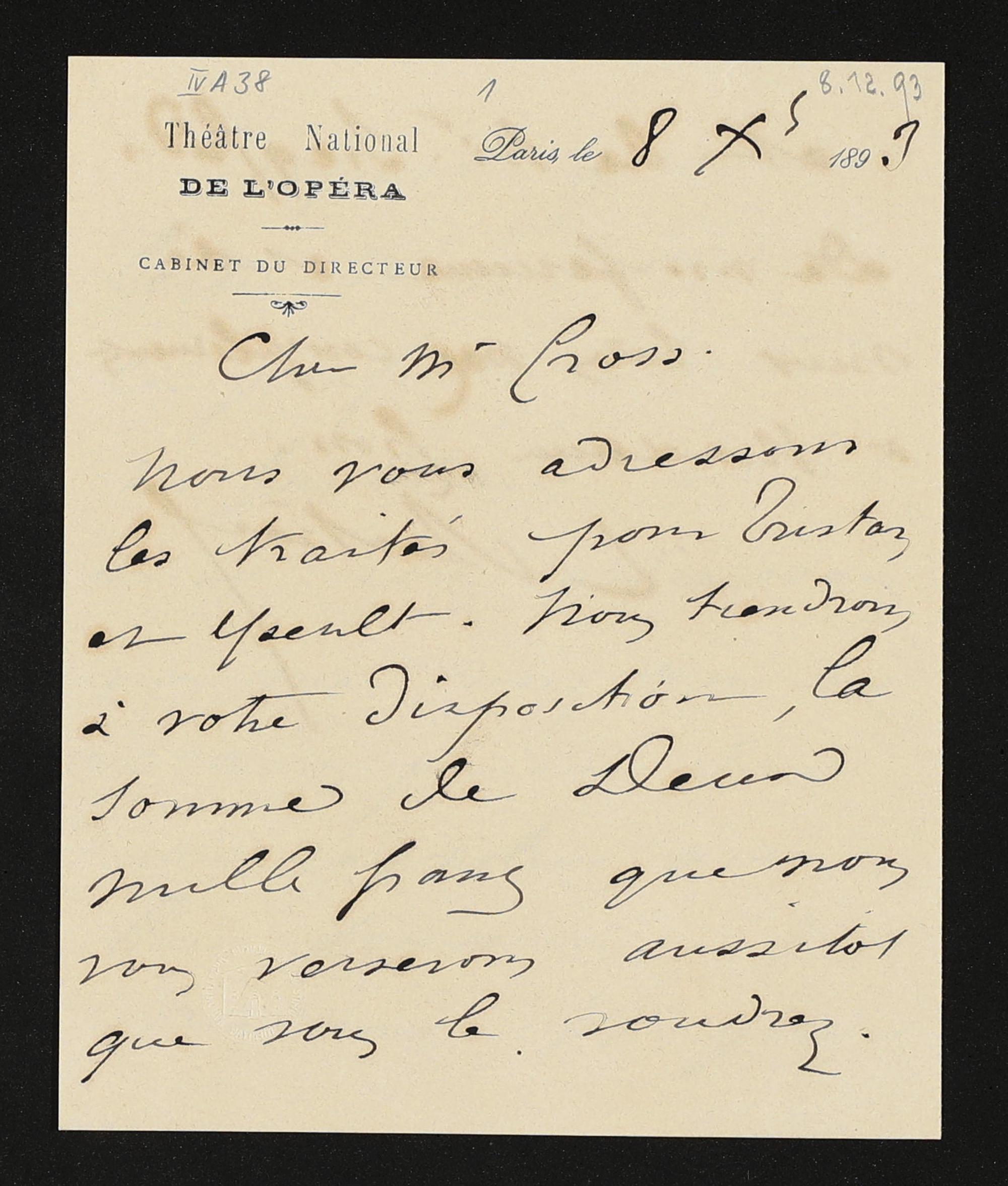 eigenhändiger Brief von Eugène Bertrand (Théâtre National de l'Opéra, Cabinet du directeur) an Adolf von Gross
