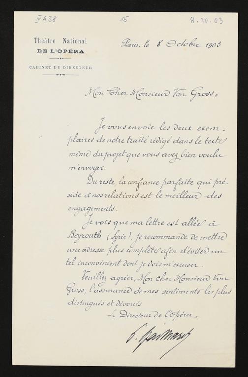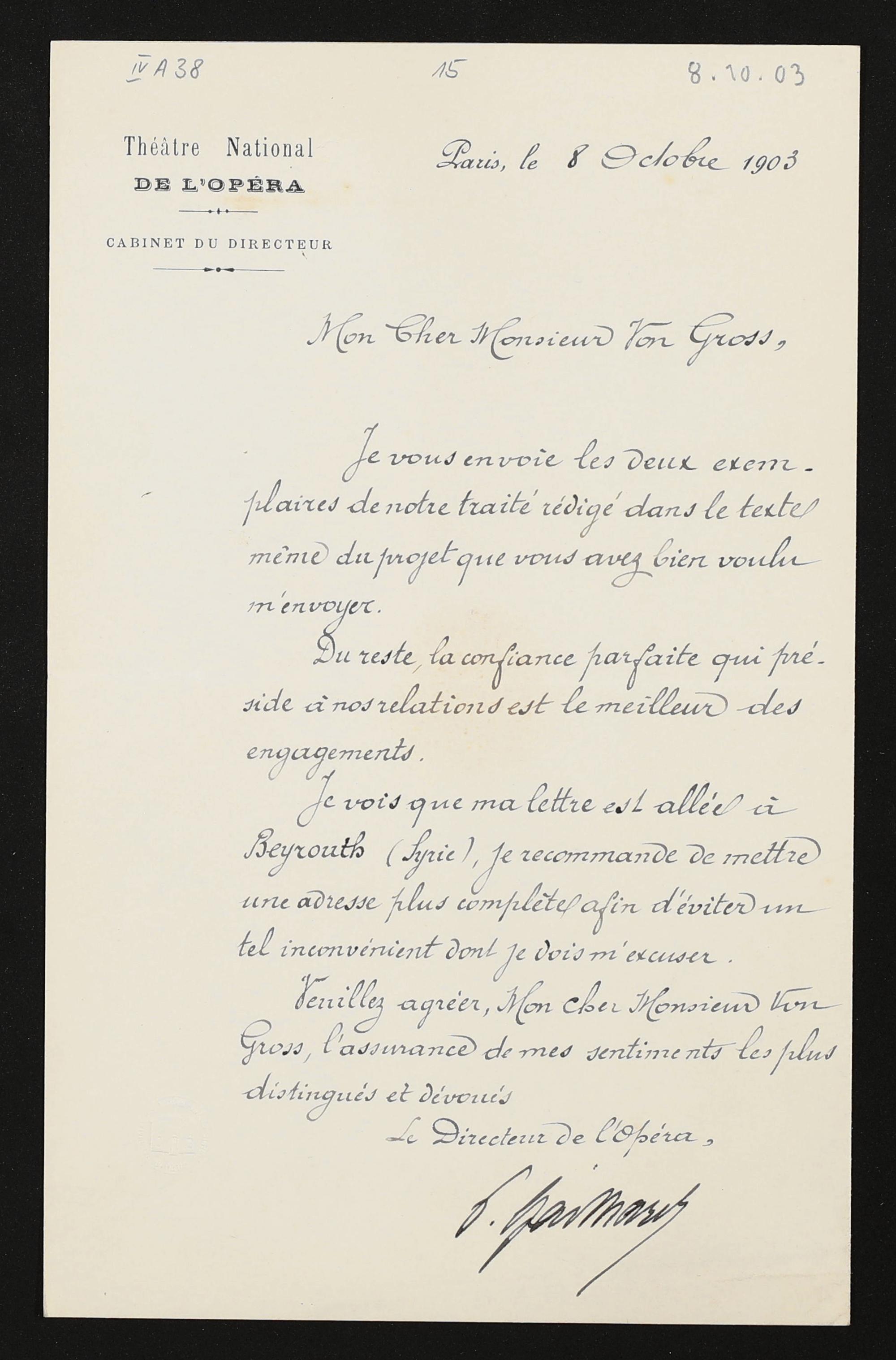 eigenhändiger Brief von Pierre Gailhard (Théâtre National de l'Opéra, Cabinet du directeur) an Adolf von Gross