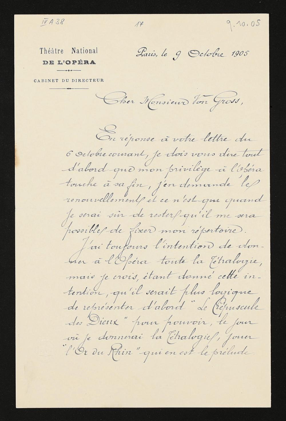 eigenhändiger Brief von Pierre Gailhard (Théâtre National de l'Opéra, Cabinet du directeur) an Adolf von Gross