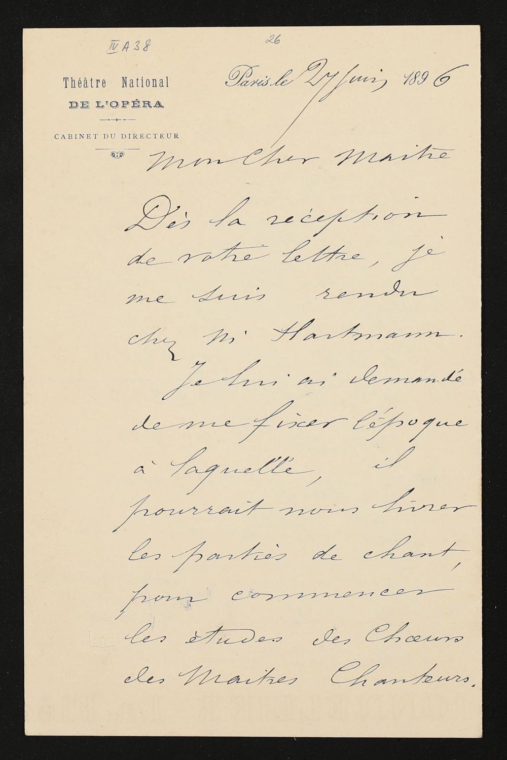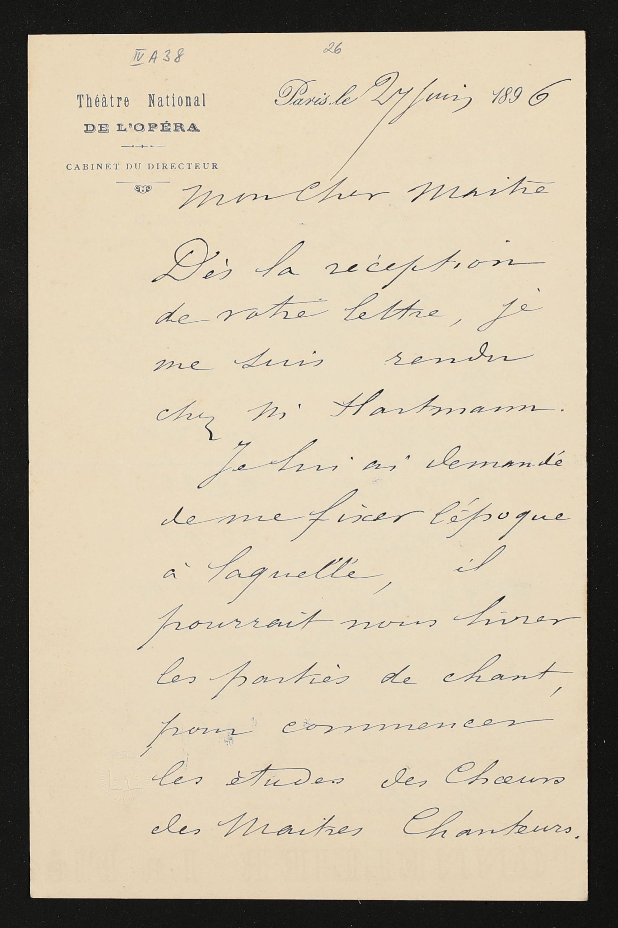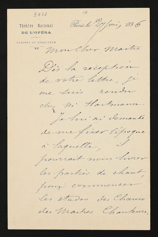 eigenhändiger Brief mutmaßlich von Eugène Bertrand und Pierre Gailhard (Théâtre National de l'Opéra, Cabinet du directeur) mutmaßlich an Adolf von Gross