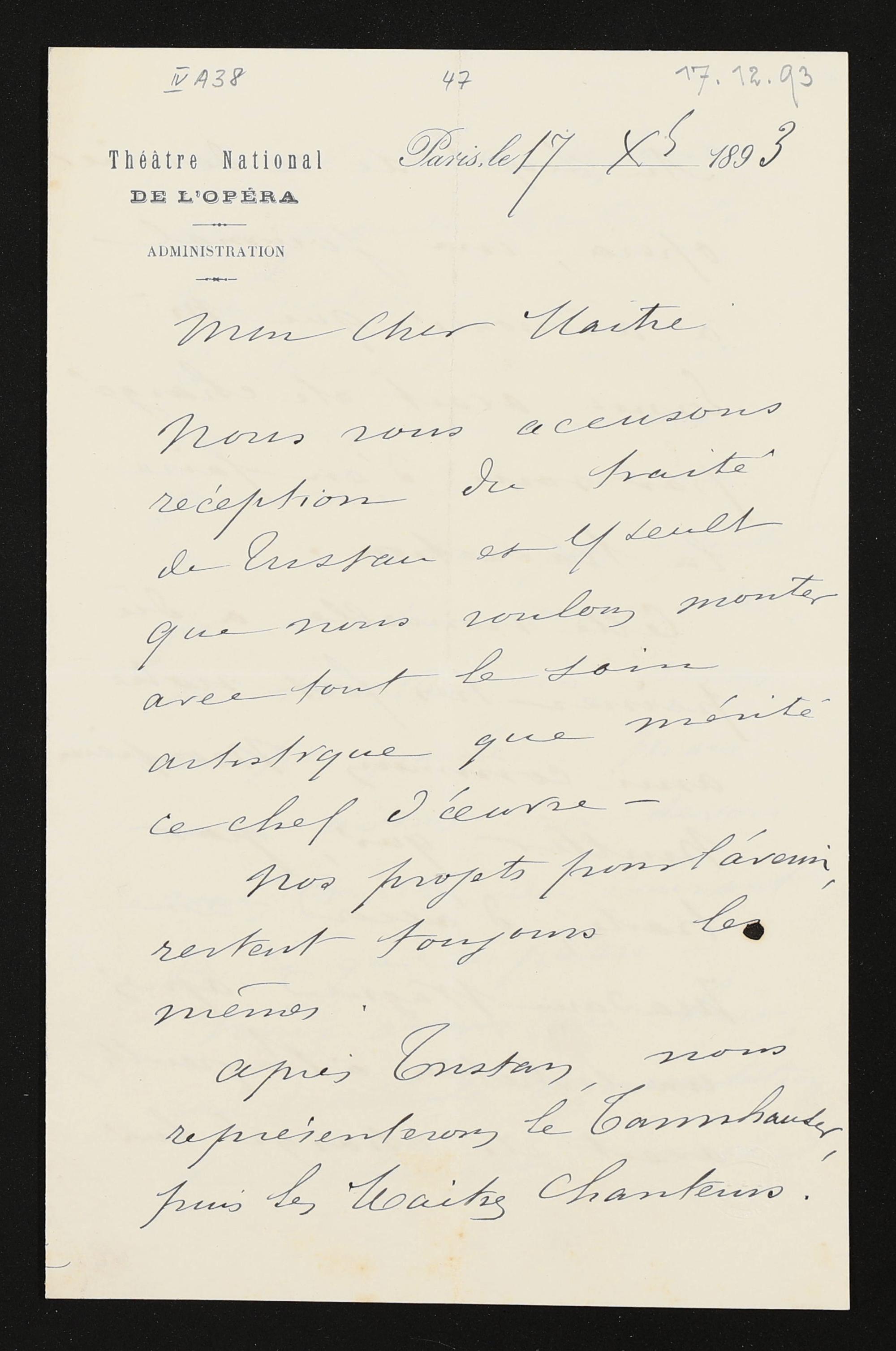 eigenhändiger Brief mutmaßlich von Eugène Bertrand und von Pierre Gailhard (Théâtre National de l'Opéra, Cabinet du directeur) mutmaßlich an Adolf von Gross