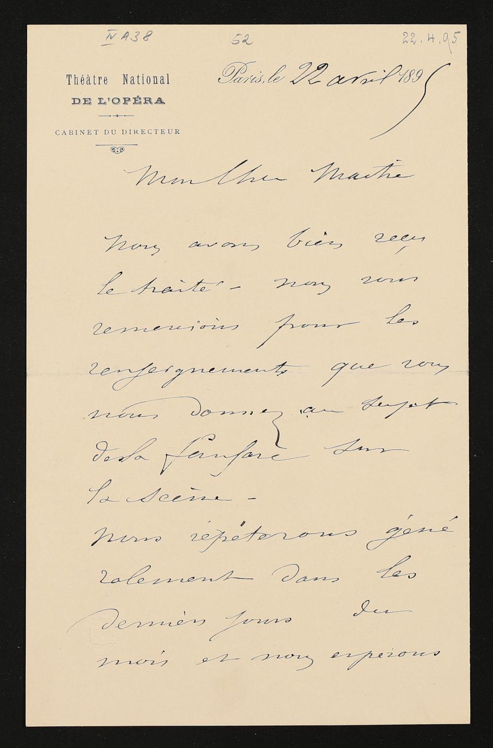 eigenhändiger Brief mutmaßlich von Eugène Bertrand und von Pierre Gailhard (Théâtre National de l'Opéra, Cabinet du directeur) mutmaßlich an Adolf von Gross