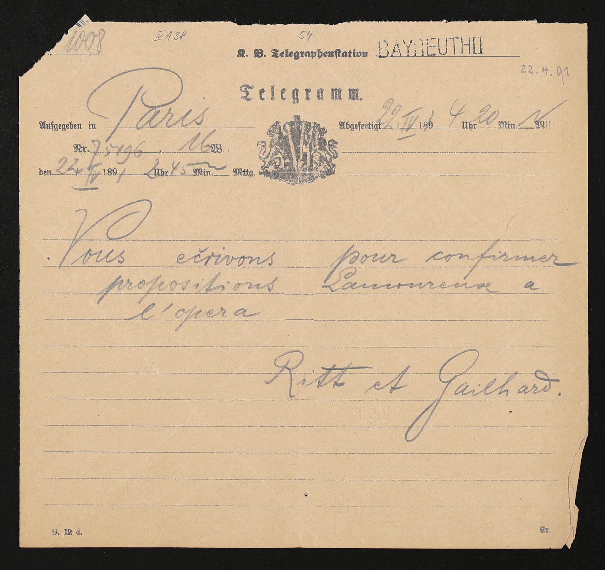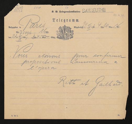 Telegramm von E. Ritt und Pierre Gailhard an Adolf von Gross