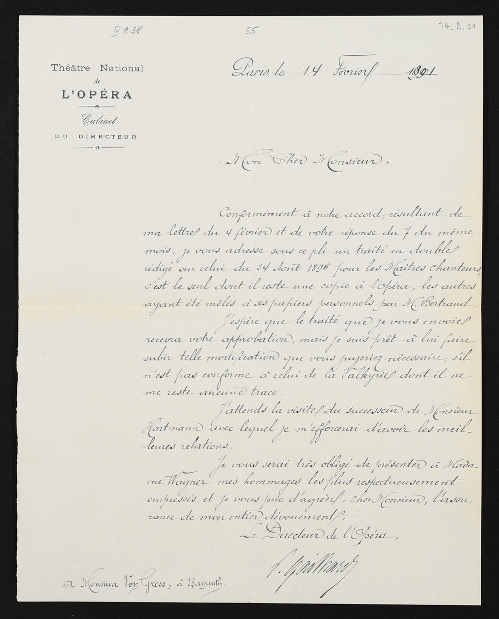 eigenhändiger Brief von Pierre Gailhard (Théâtre National de l'Opéra, Cabinet du directeur) an Adolf von Gross