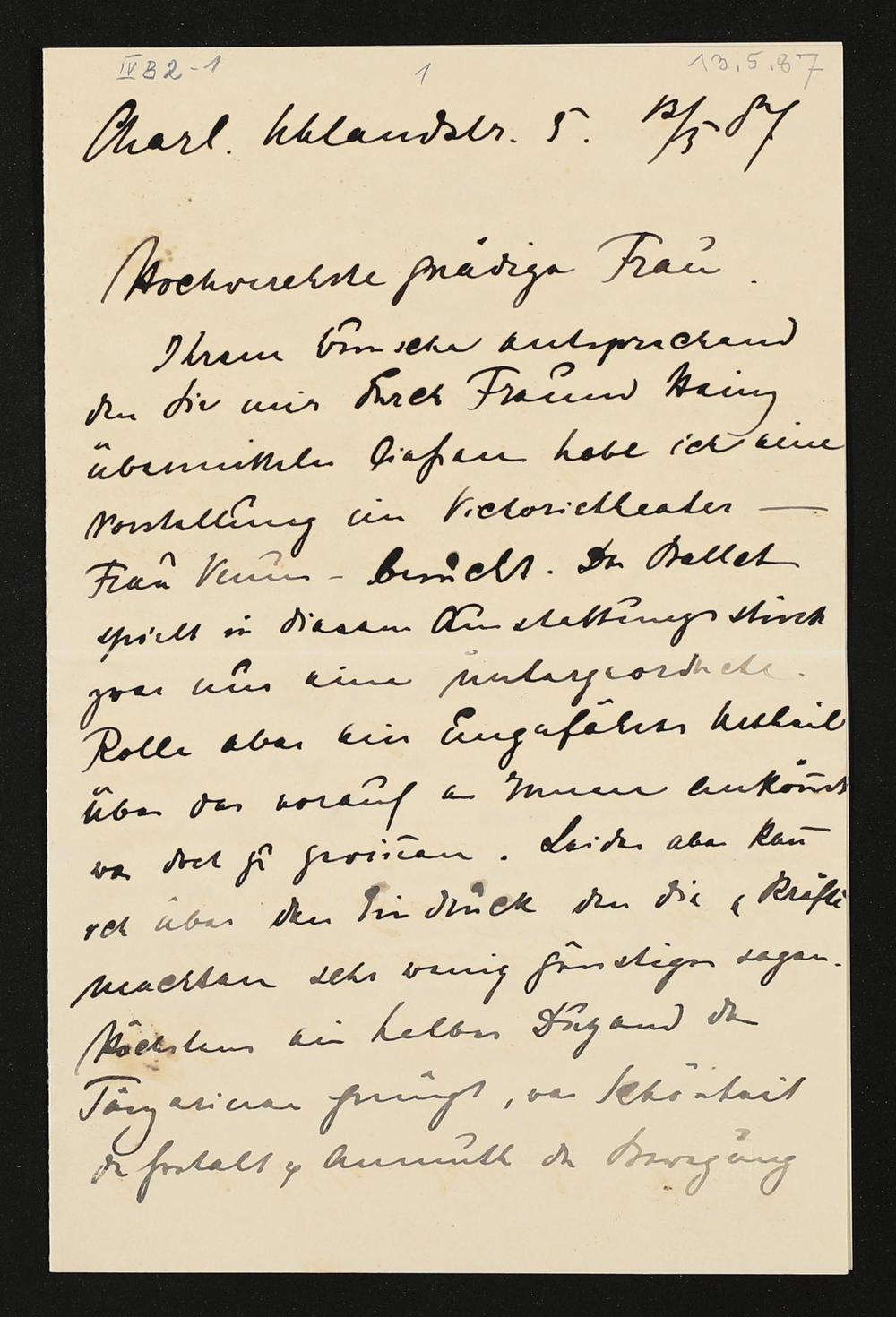 eigenhändiger Brief von Hugo von Tschudi an Cosima Wagner