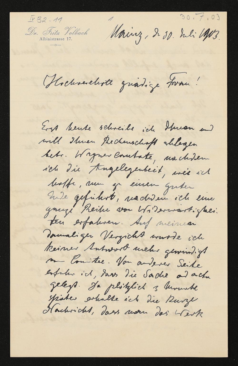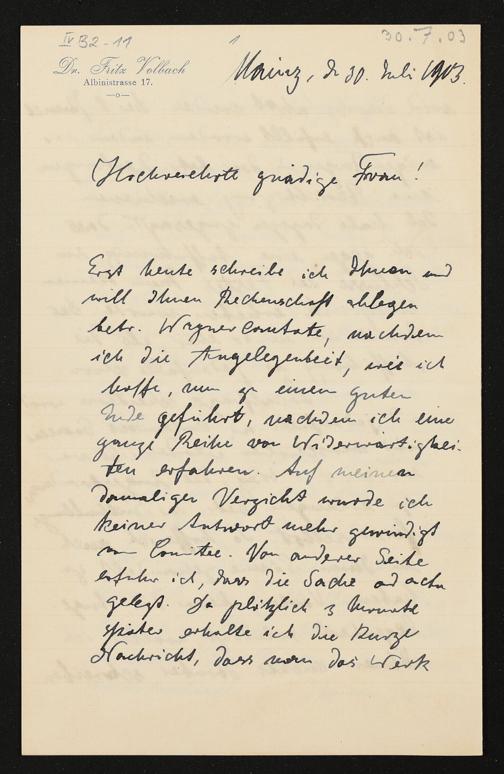 eigenhändiger Brief von Fritz Volbach an Cosima Wagner