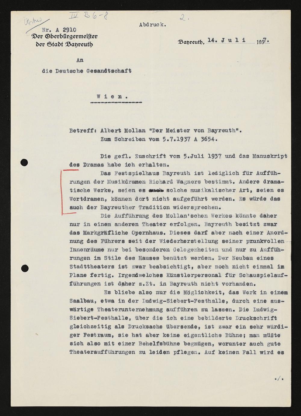 maschinenschriftlicher Brief von Unbekannt Keller (in Vertretung des Oberbürgermeisters der Stadt Bayreuth) an die Deutsche Gesandtschaft Wien