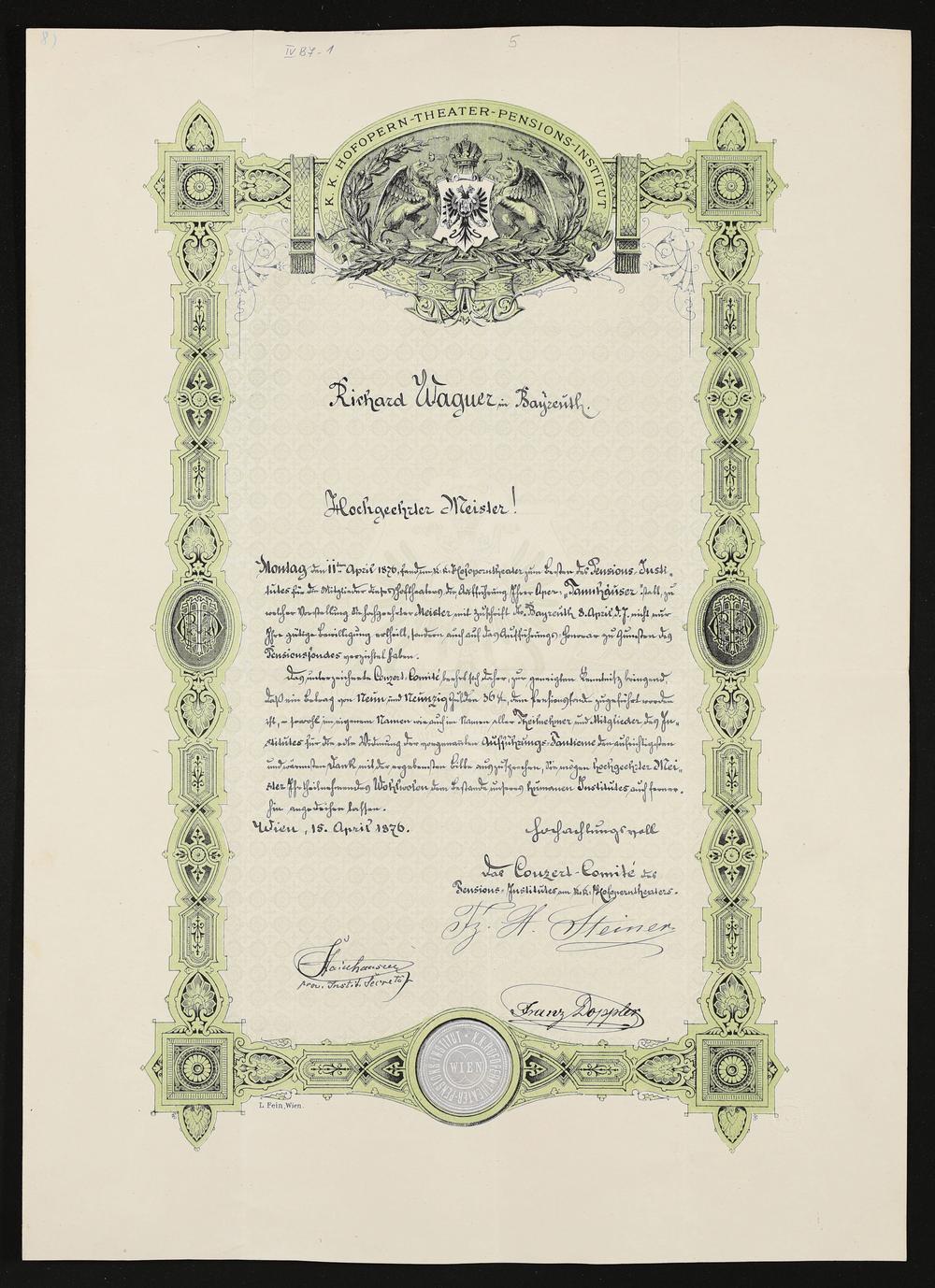 eigenhändige Urkunde des Concert-Comités der Wiener Hofoper an Richard Wagner