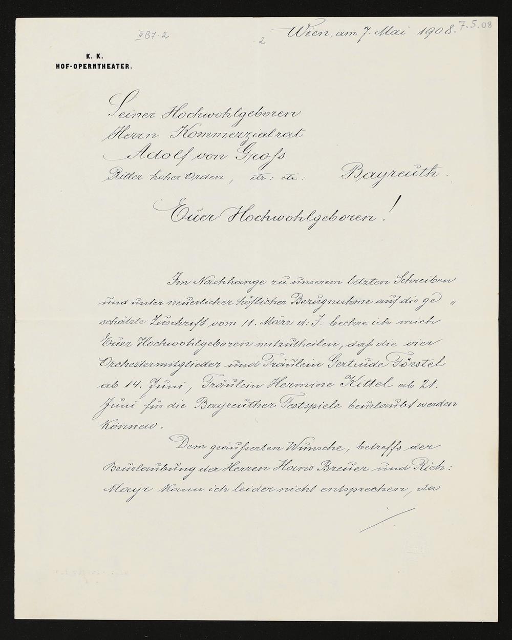 eigenhändiger Brief von einem unbekannten Verfasser (Direktion des kaiserlich-königlichen Hofoperntheaters Wien) an Adolf von Gross