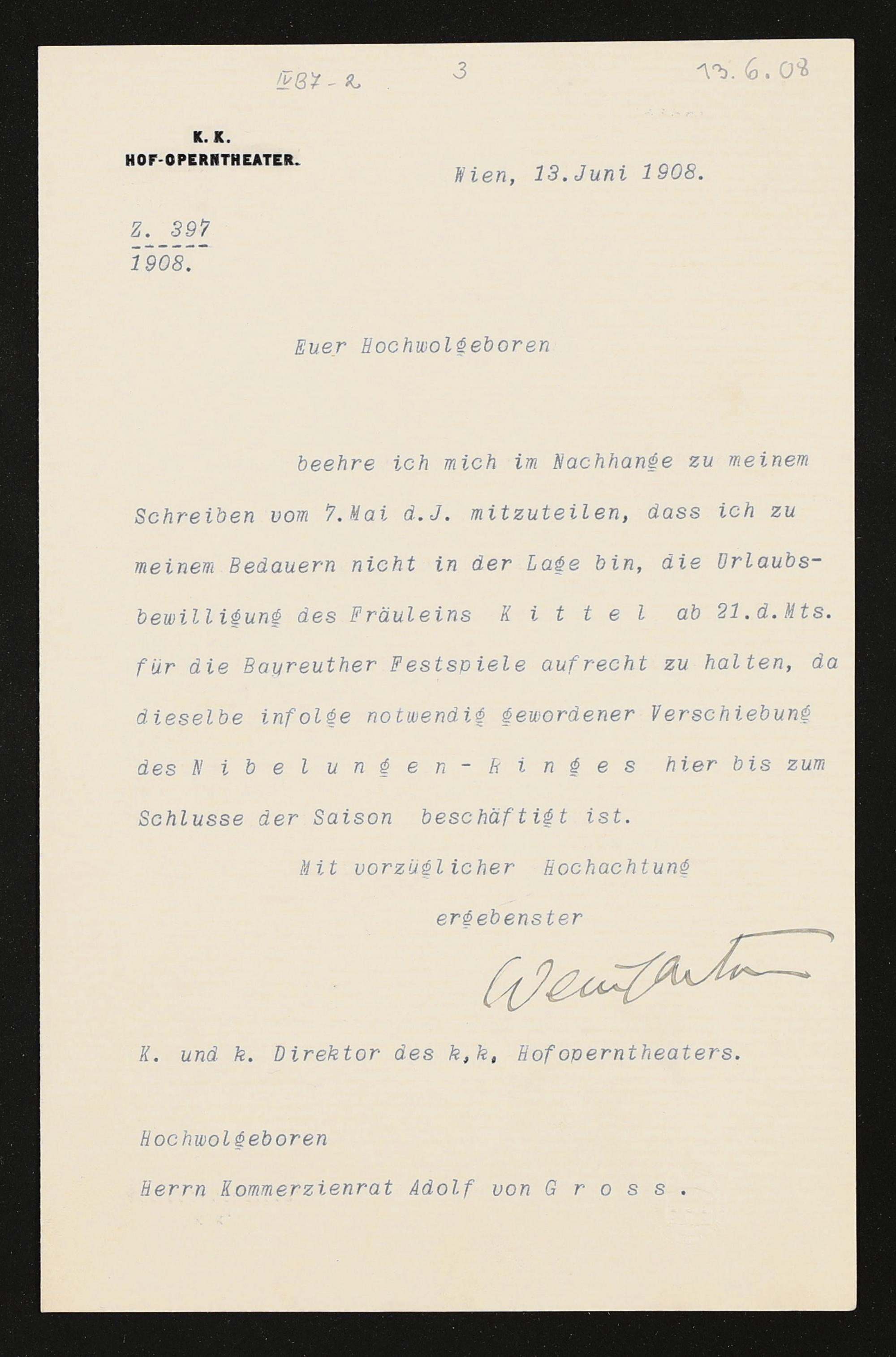 maschinenschriftlicher Brief von Unbekannt Wemlaitner (Direktion des kaiserlich-königlichen Hofoperntheaters Wien) an Adolf von Gross