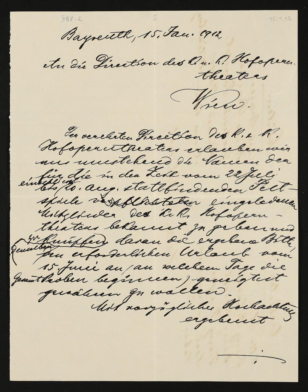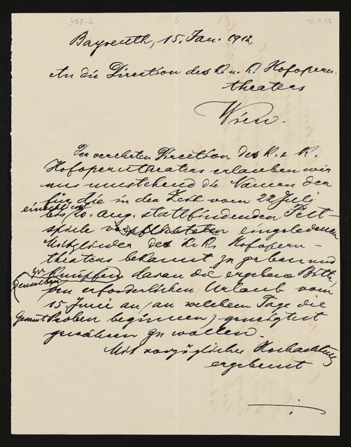 eigenhändiger Brief von Adolf von Gross an die Direktion des kaiserlich-königlichen Hofoperntheaters Wien