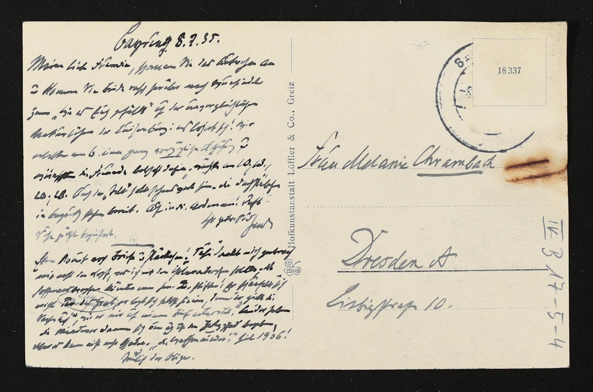 eigenhändige Postkarte von Hans von Wolzogen mutmaßlich an Melanie Chrambach