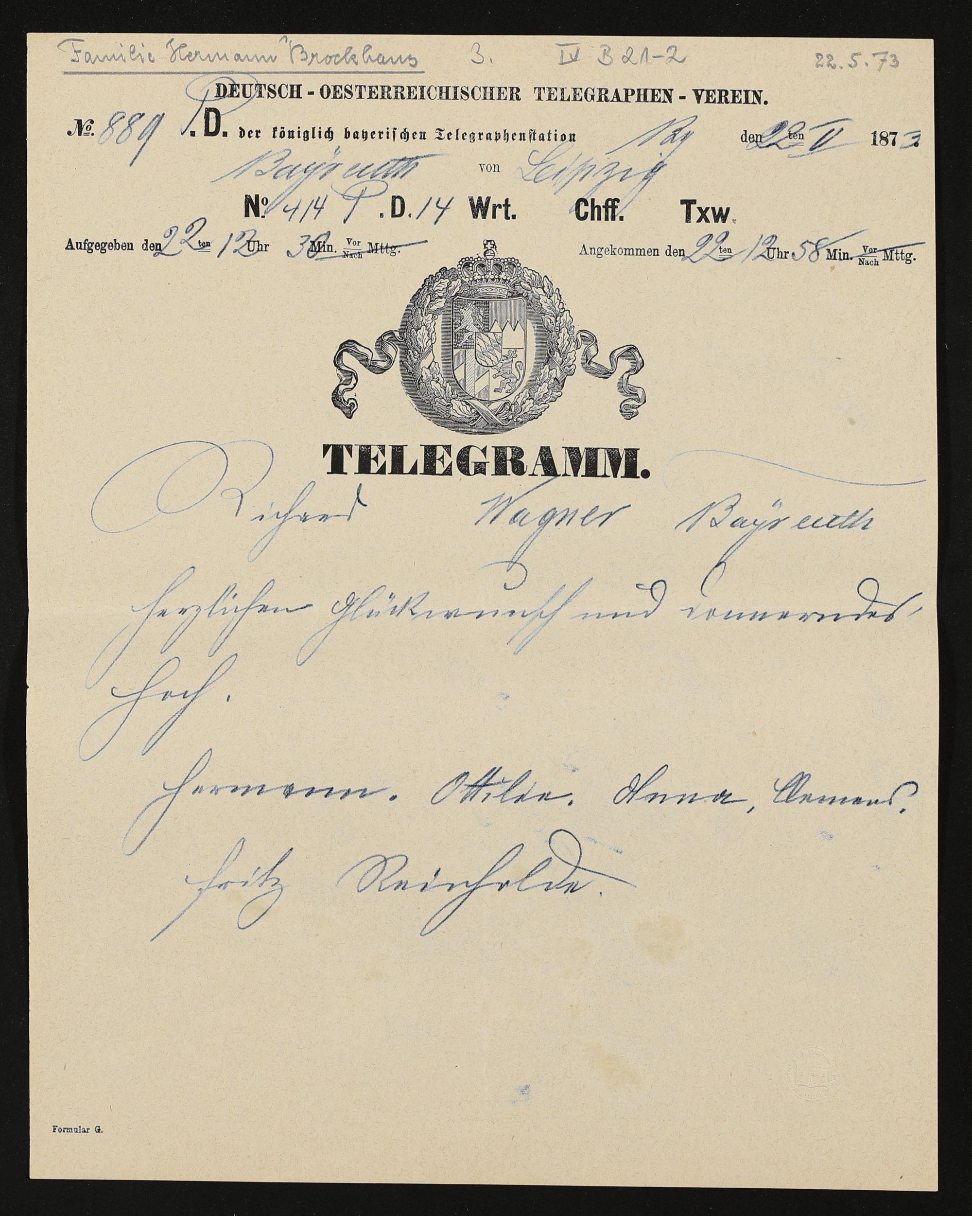 Telegramm mutmaßlich von Clemens Brockhaus, Clara Brockhaus, Heinrich Brockhaus, Heinrich E. Brockhaus, Reinhold Brockhaus, Ottilie Brockhaus (jun.) und Ottilie Brockhaus (sen.) an Richard Wagner