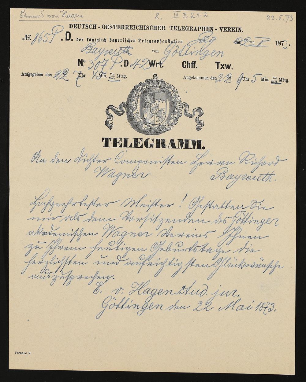 Telegramm von Edmund von Hagen an Richard Wagner
