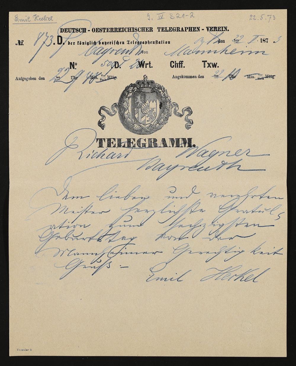 Telegramm von Emil Heckel an Richard Wagner