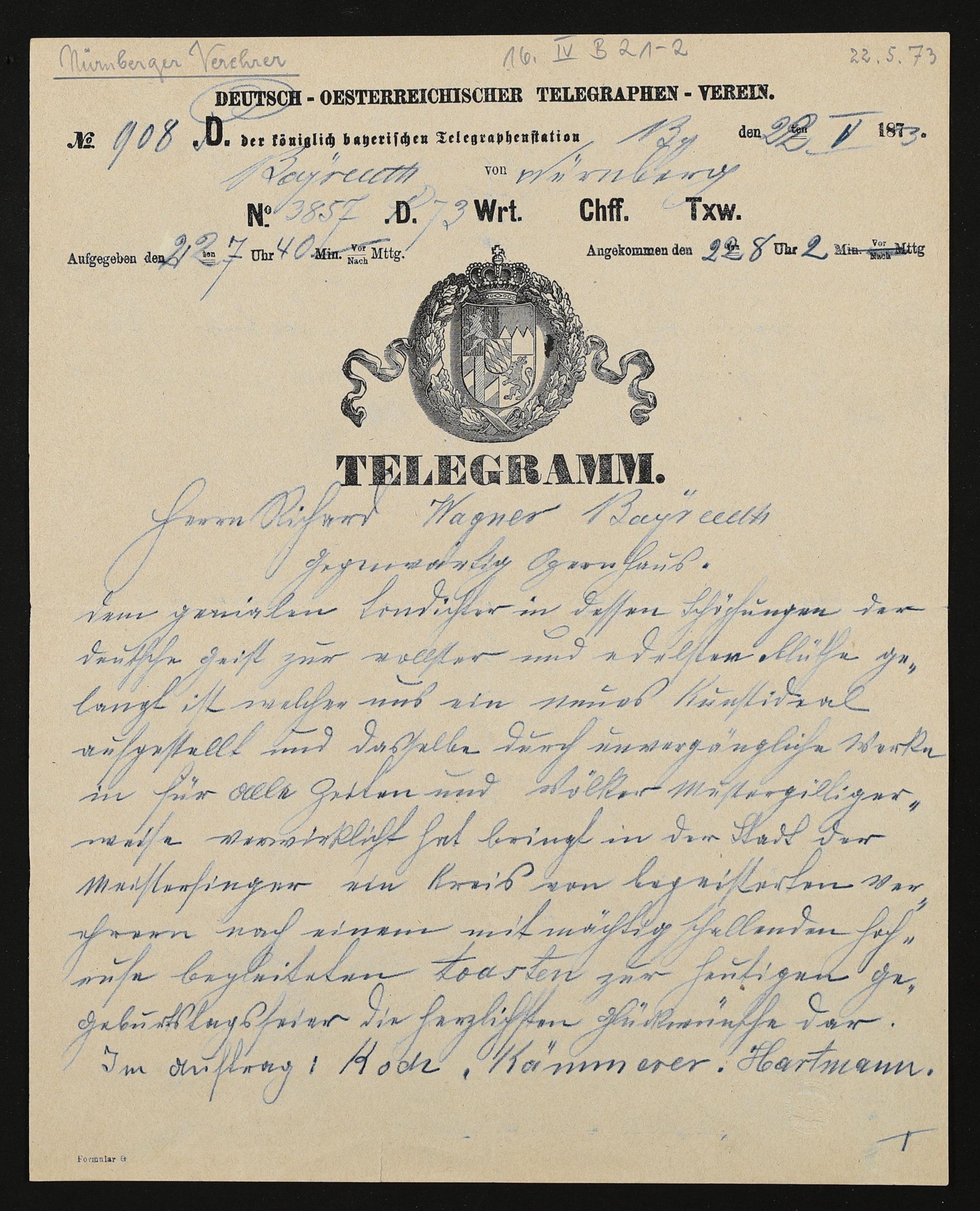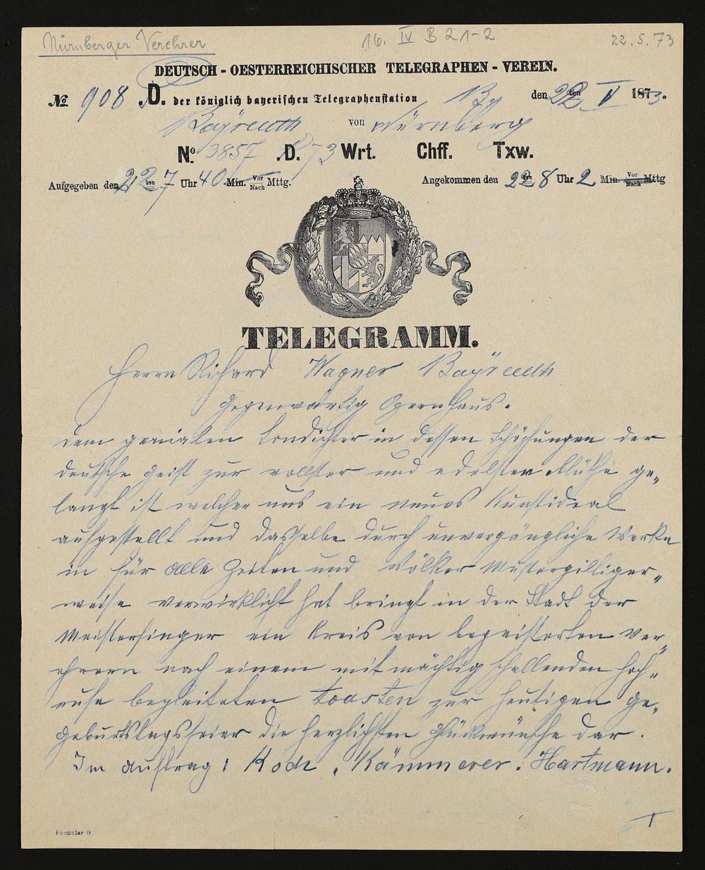 Telegramm von Unbekannt Koch, Unbekannt Kämmerer, Unbekannt Hartmann an Richard Wagner