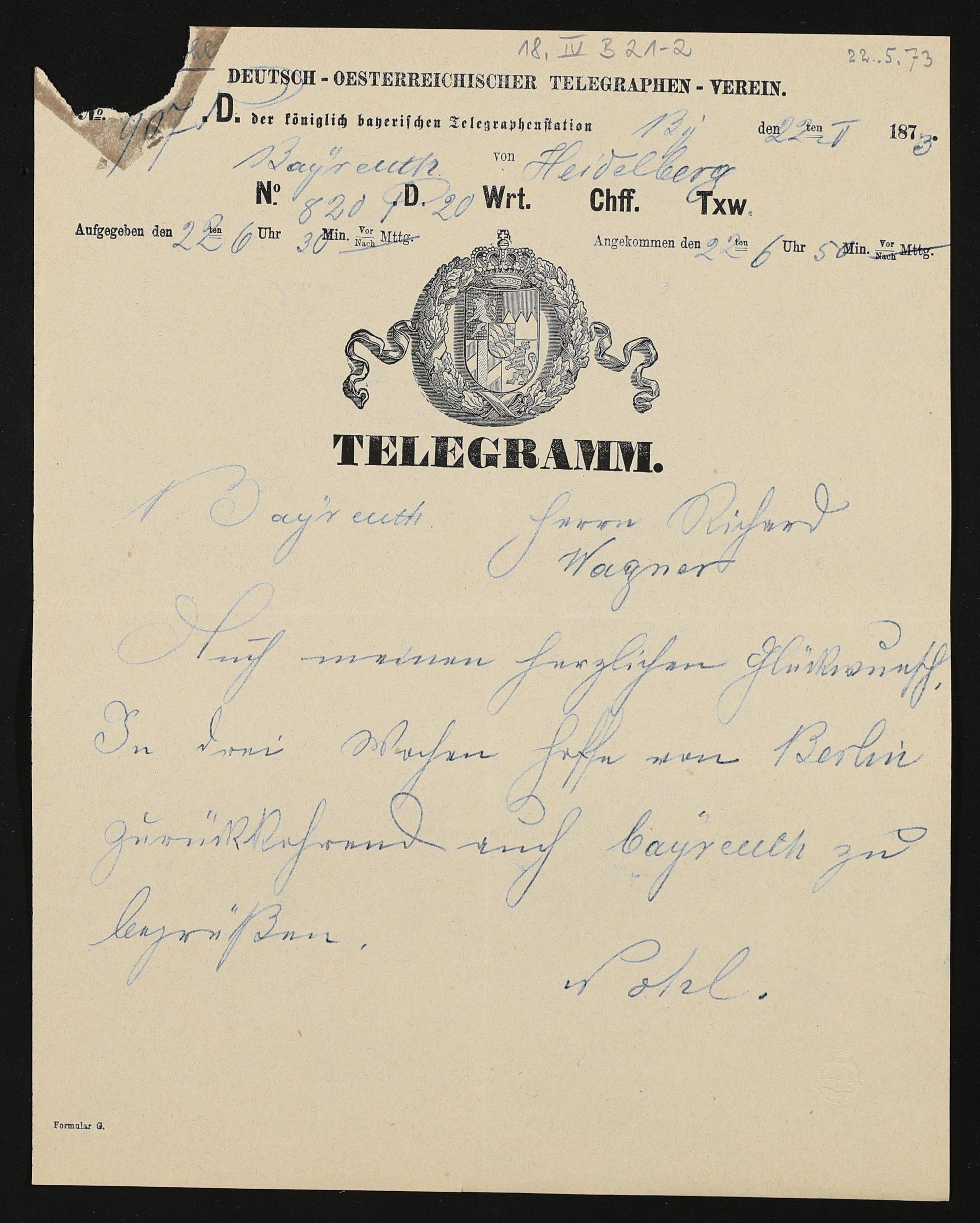 Telegramm mutmaßlich von Richard Pohl an Richard Wagner