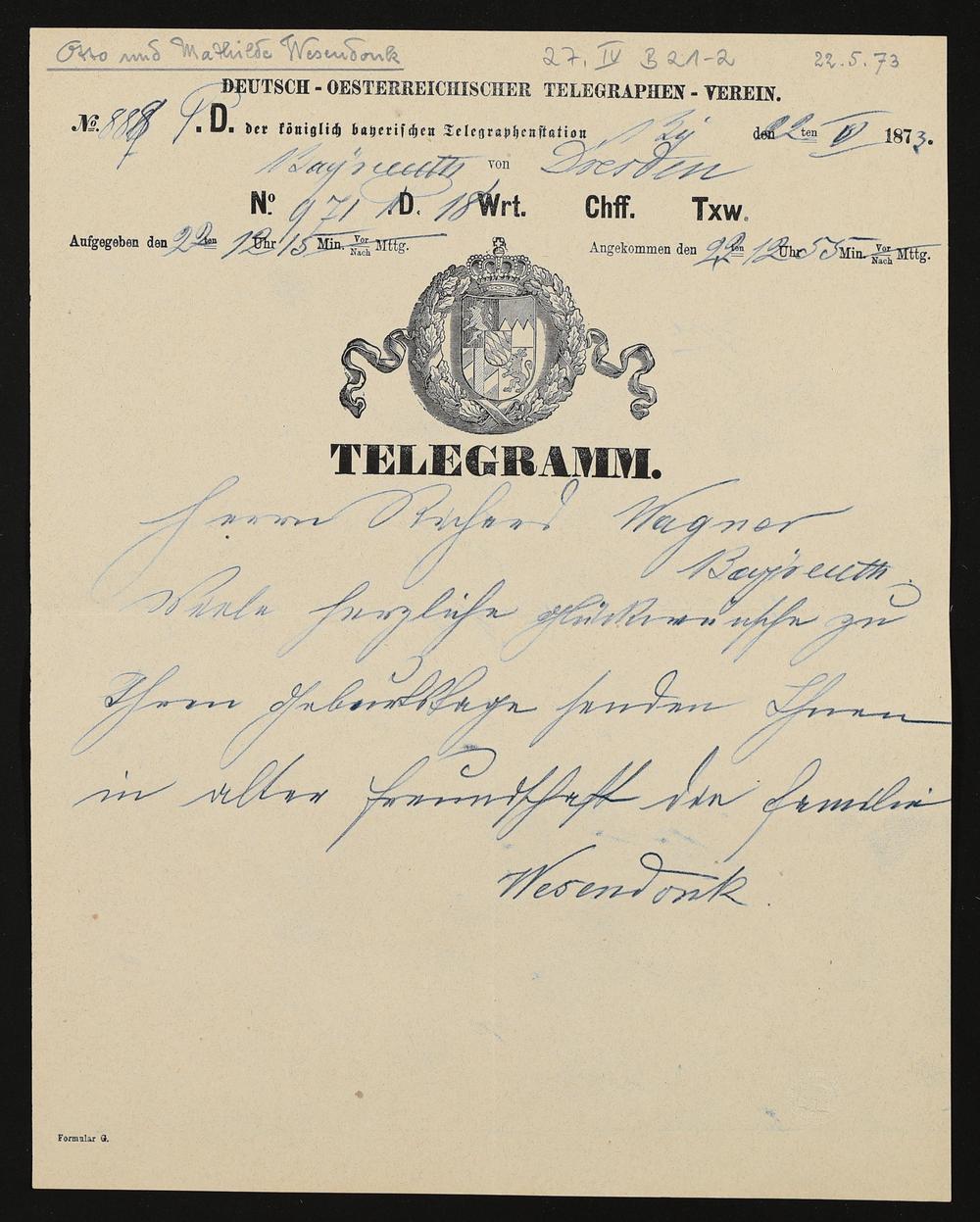 Telegramm von der Familie Wesendonck an Richard Wagner