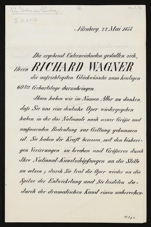 gedruckter Brief von G. Koch, Prof. Dr. Kämmerer, T. Hiller, F. Grötsche, Prof. Dr. Weiß, J. Schilling, A. Goehrmann, D. Unbekannt, Fr. Engelhardt, an Richard Wagner