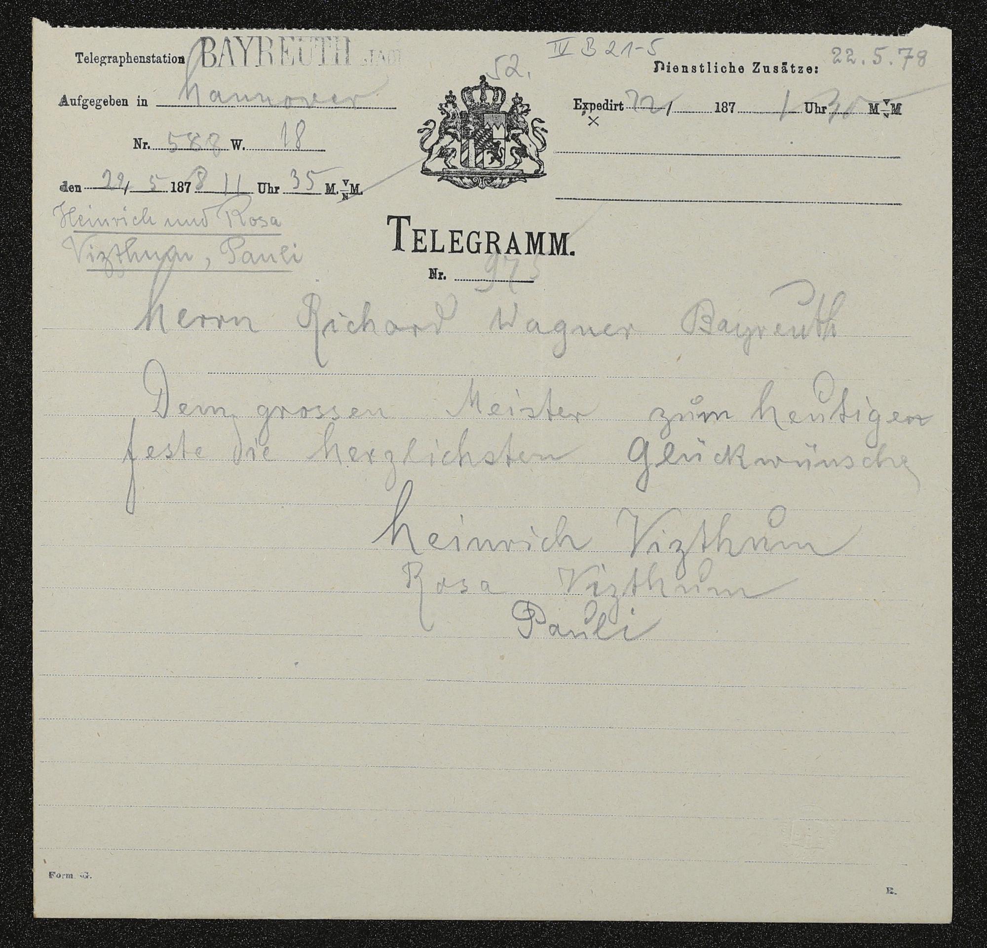 Telegramm von Heinrich Vizthum und Rosa Vizthum Pauli an Richard Wagner