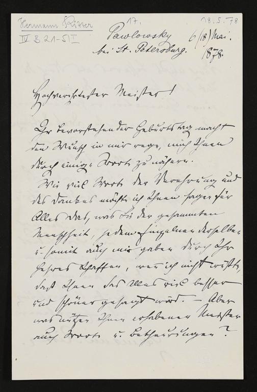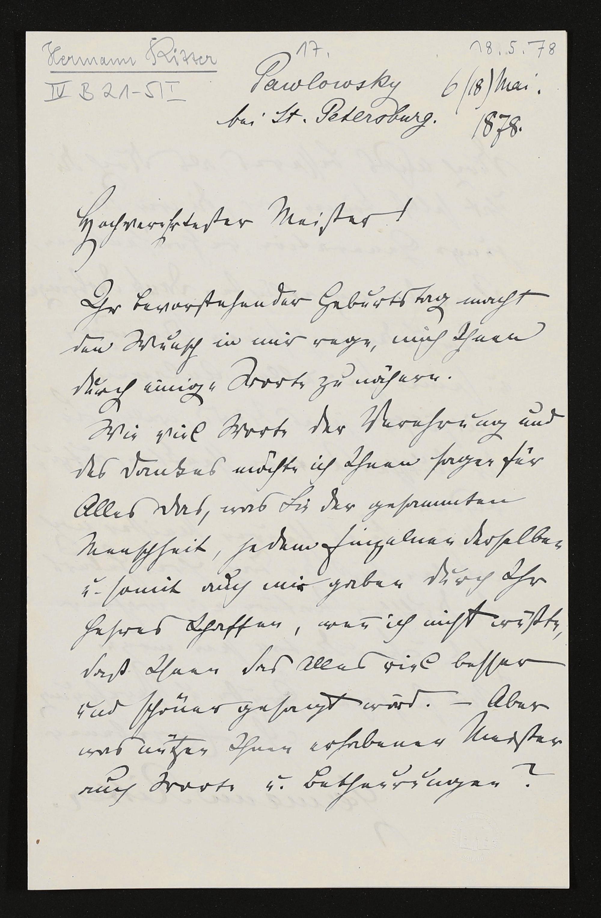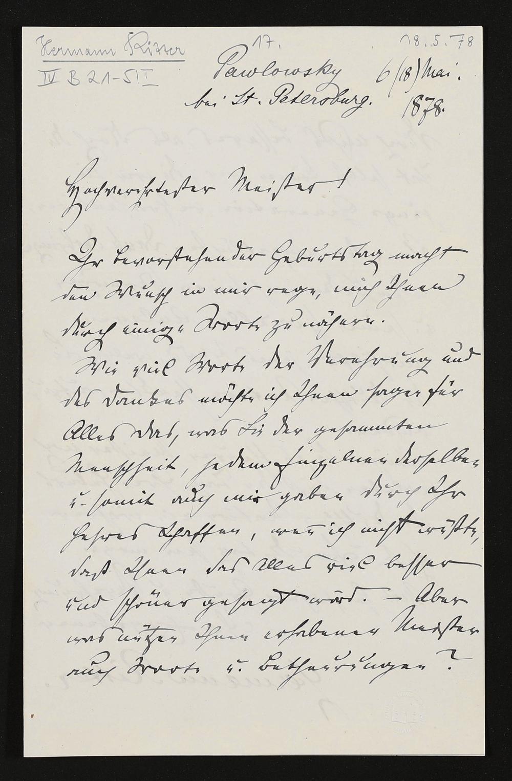 eigenhändiger Brief von Hermann Ritter an Richard Wagner