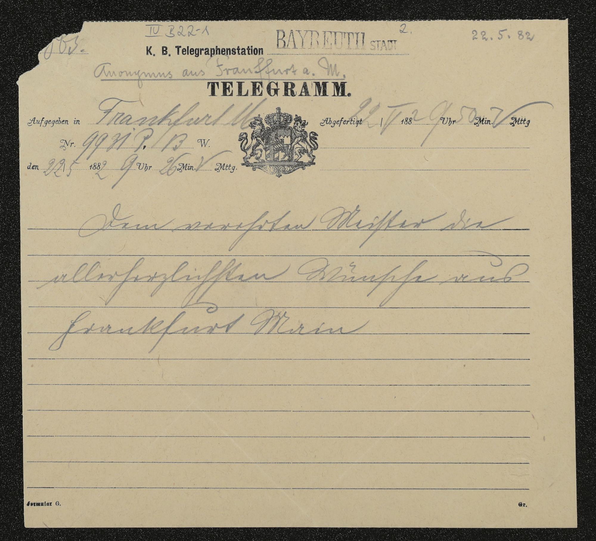 Telegramm von einem unbekannten Absender an Richard Wagner