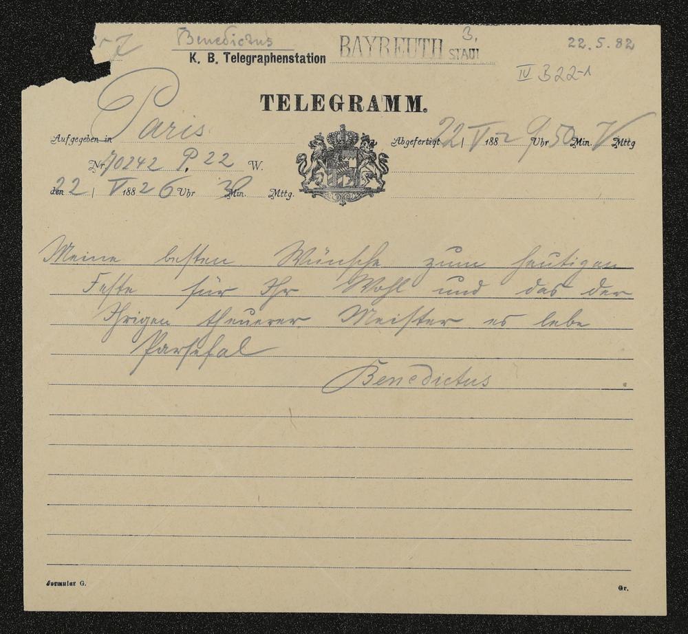 Telegramm von Unbekannt Benedictus an Richard Wagner