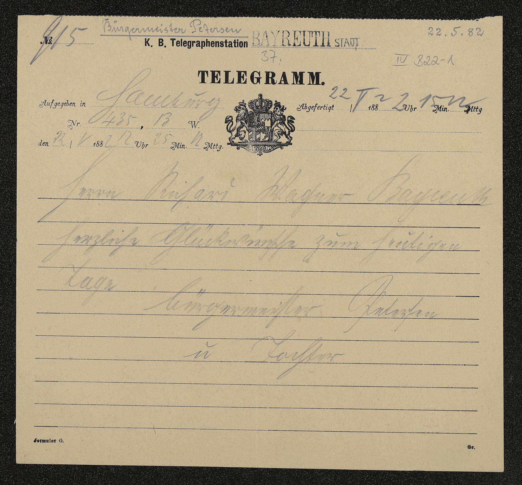 Telegramm von Carl Friedrich Petersen an Richard Wagner