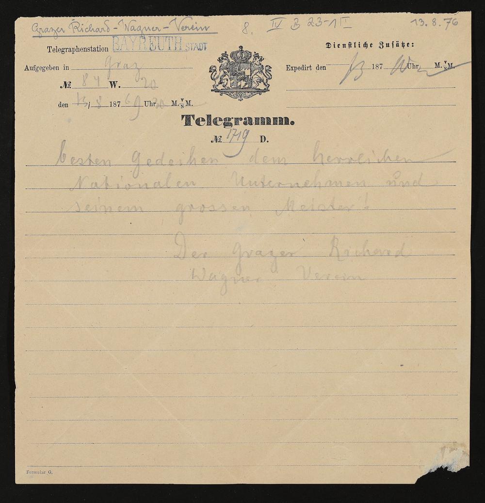 Telegramm vom Richard Wagner Verein Graz an Richard Wagner