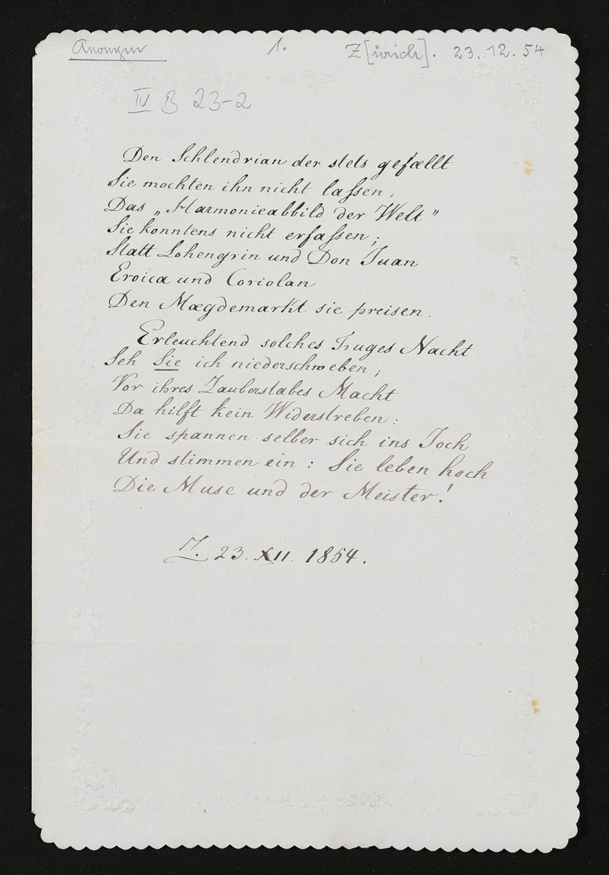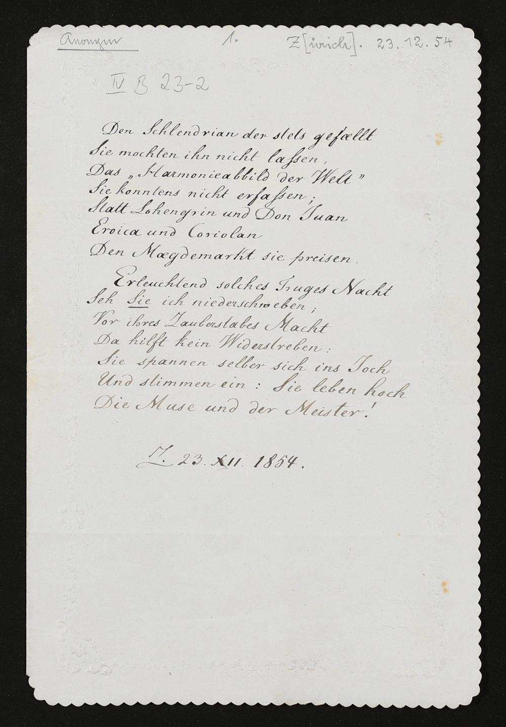 eigenhändiges Gedicht von einem unbekannten Verfasser an Richard Wagner
