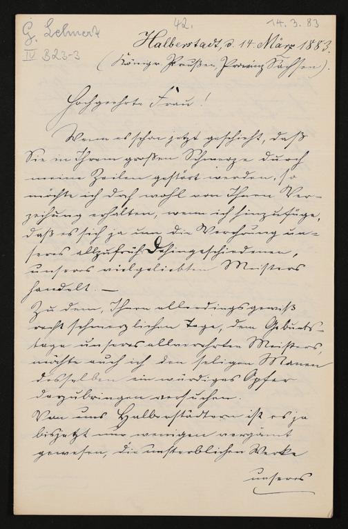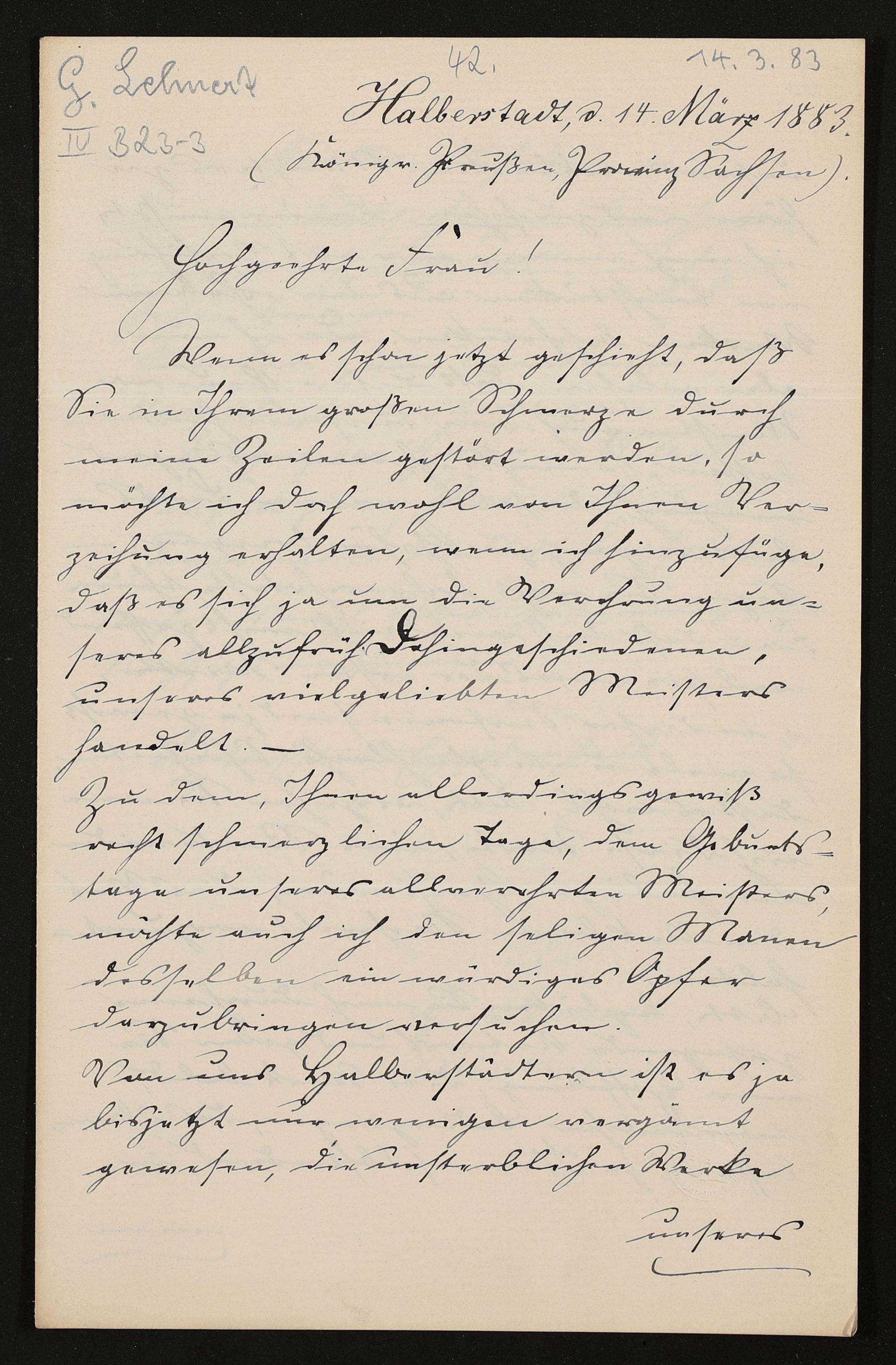 eigenhändiger Brief von G. Lehnert an Cosima Wagner