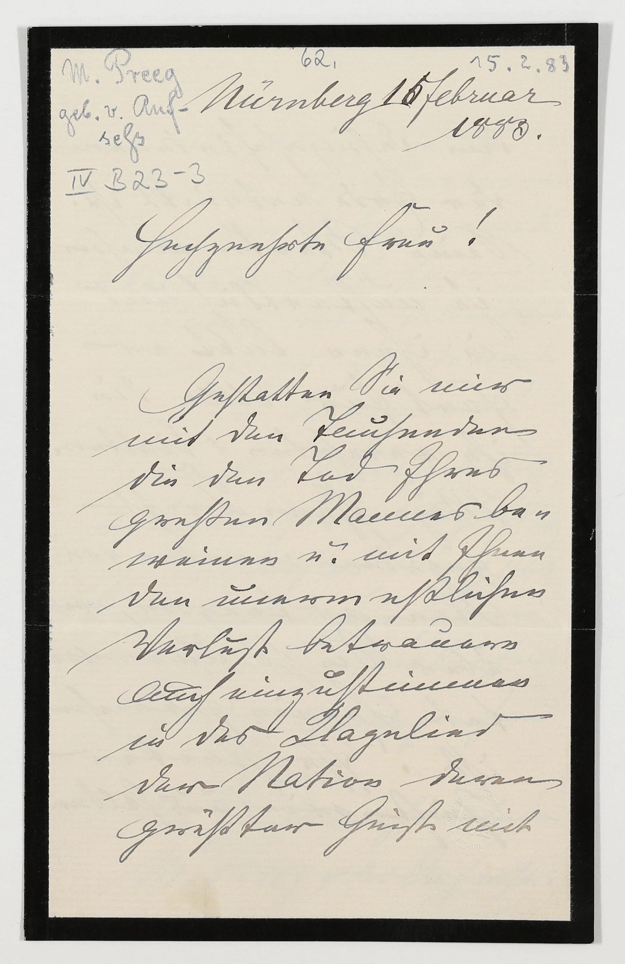 eigenhändiger Brief von M. Preeg an Cosima Wagner