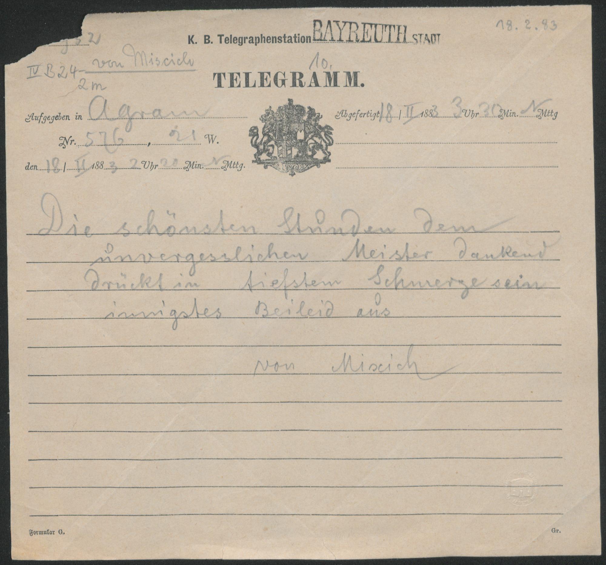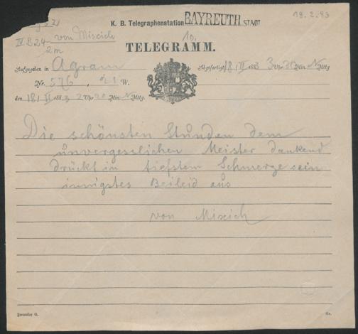 Telegramm von Unbekannt von Miscich an Cosima Wagner
