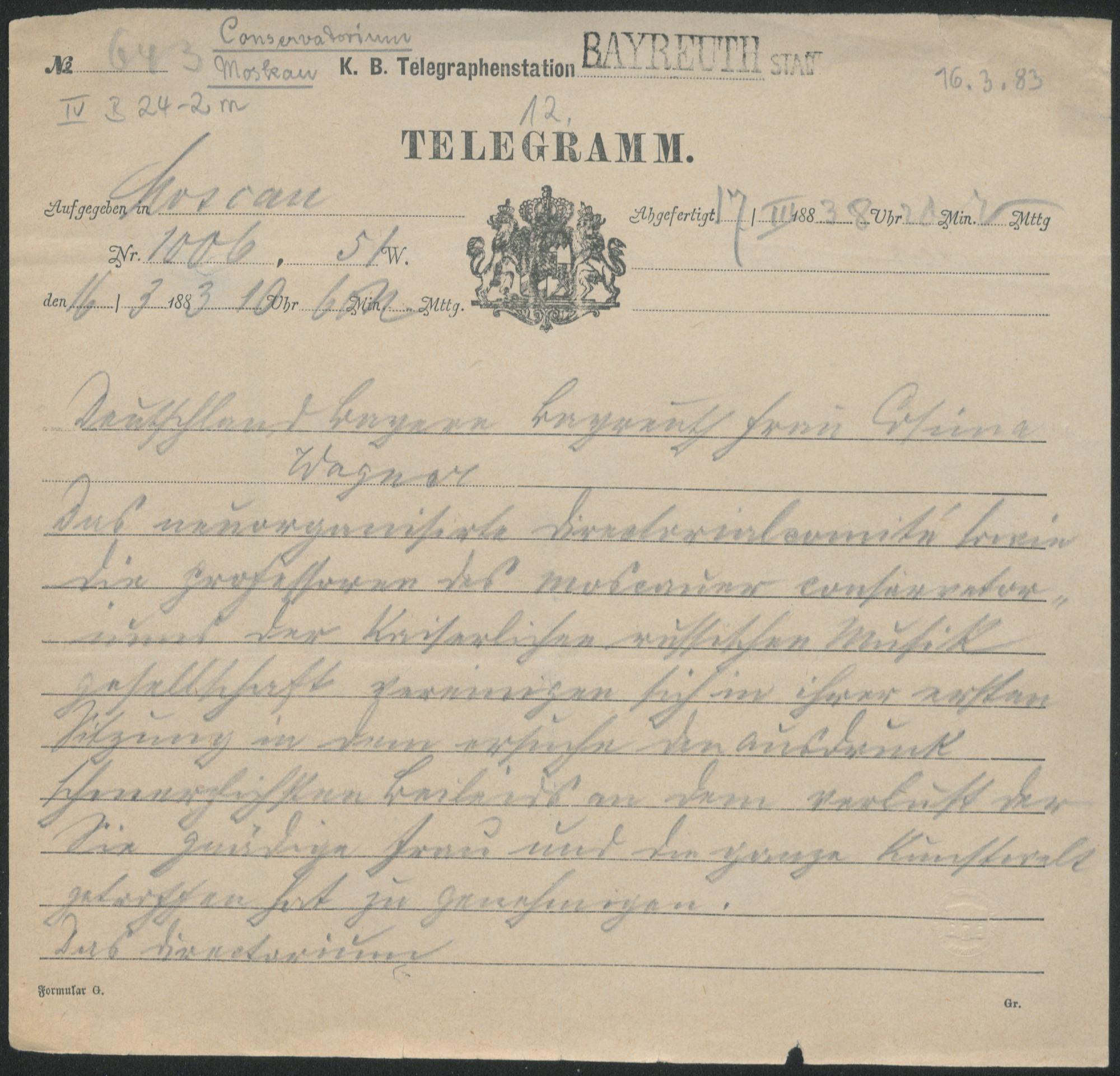 Telegramm von Konservatorium Moskau an Cosima Wagner