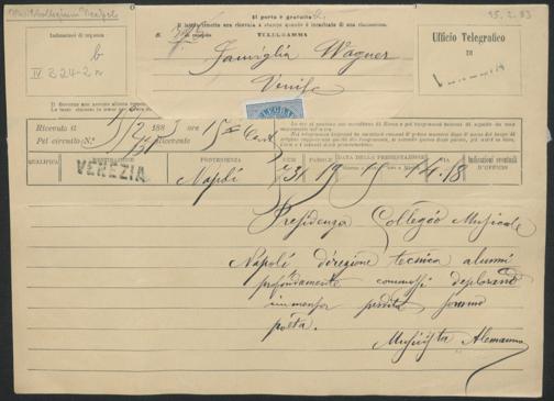 Telegramm vom Musikkollegium Neapel an Cosima Wagner, Eva Wagner, Daniela von Bülow, Siegfried Wagner, mutmaßlich Blandine Gravina und Isolde von Bülow