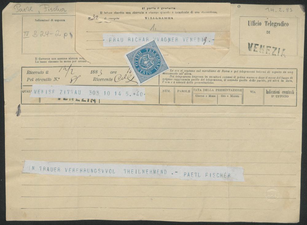 Telegramm von Unbekannt Paetl und mutmaßlich von Franz Fischer an Cosima Wagner