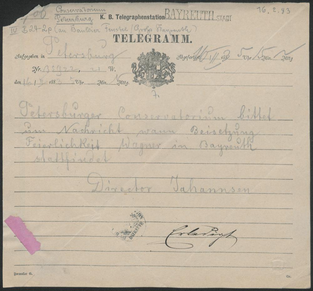 Telegramm von Direktor Johannsen (Konservatorium Sankt Petersburg) an Adolf von Gross und Friedrich Feustel