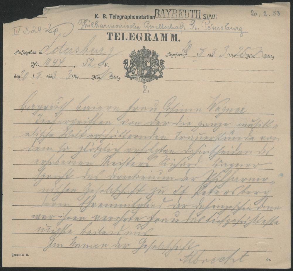 Telegramm von der Philharmonischen Gesellschaft Sankt Petersburg an Cosima Wagner