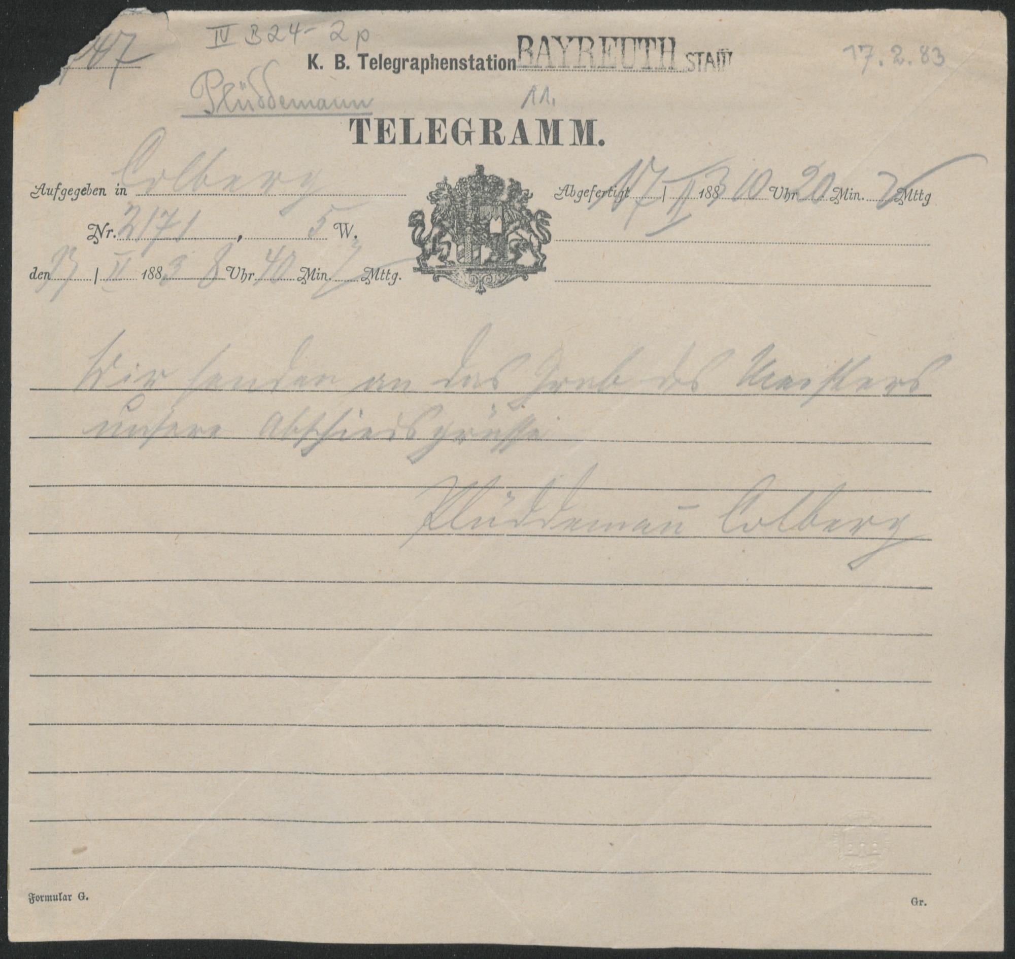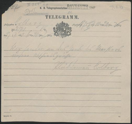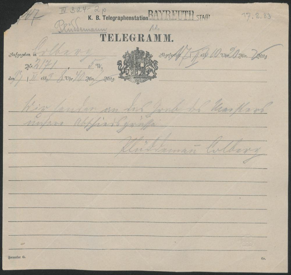 Telegramm von Martin Plüddermann an Cosima Wagner