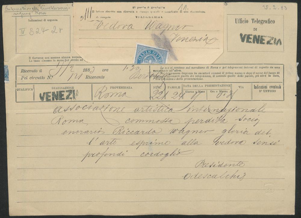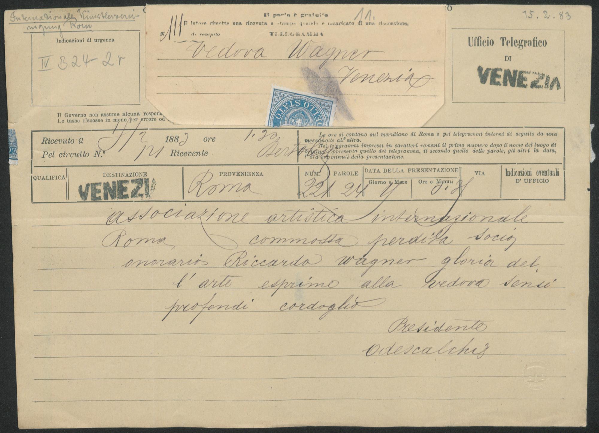 Telegramm von der Internationalen Künstlervereinigung Rom an Cosima Wagner